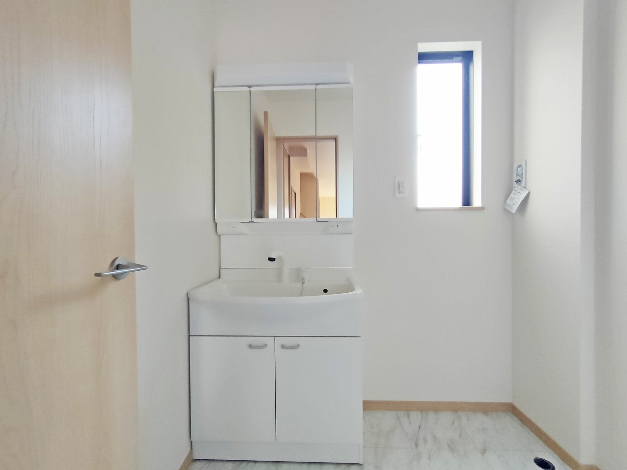 三面鏡にハンドシャワー付き、 使いやすい洗面台。