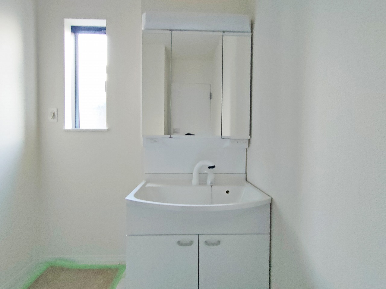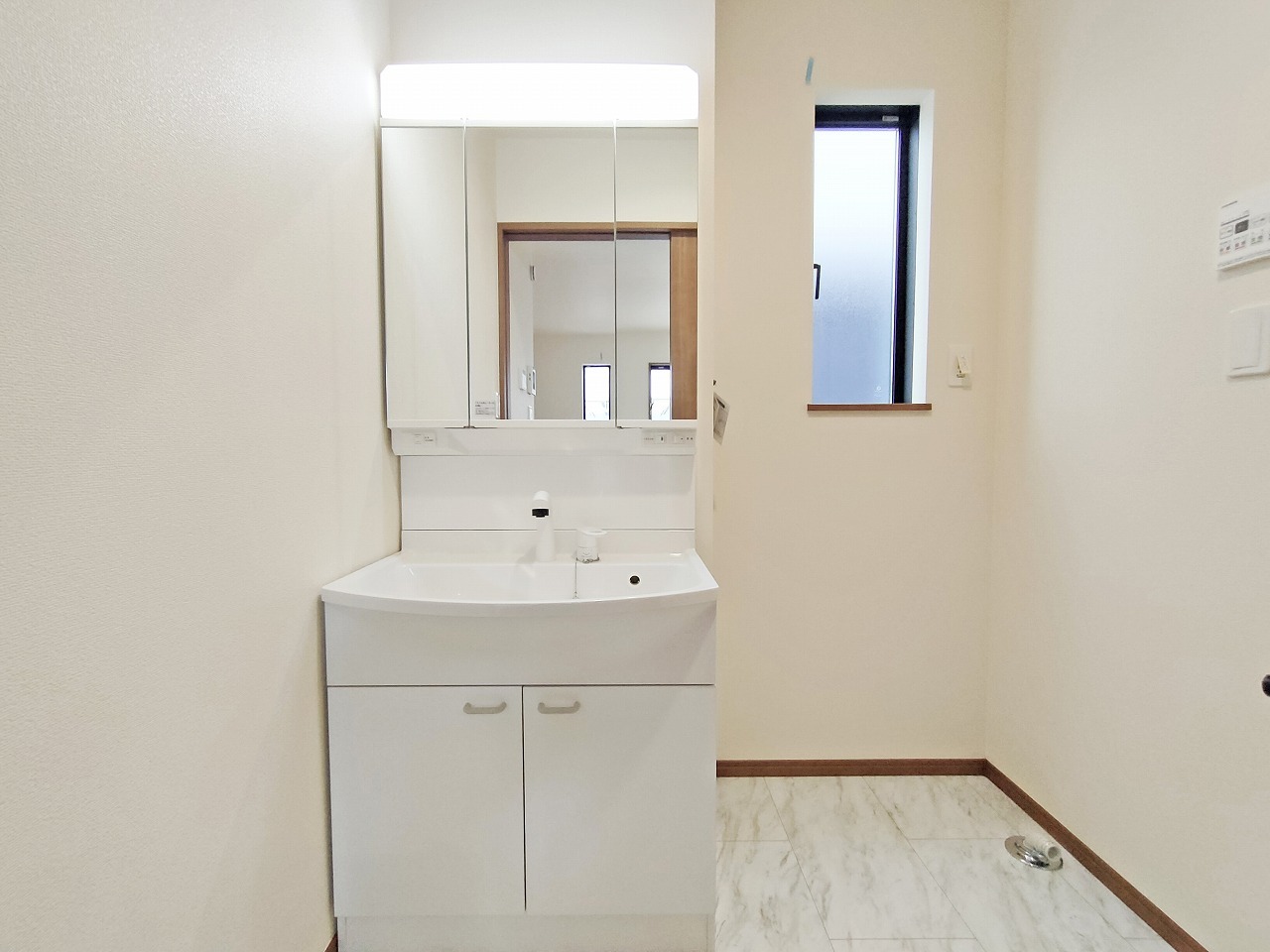 D号棟 収納豊富な三面鏡付洗面化粧台。水回りのあれこれがキレイに収まりそうですね。