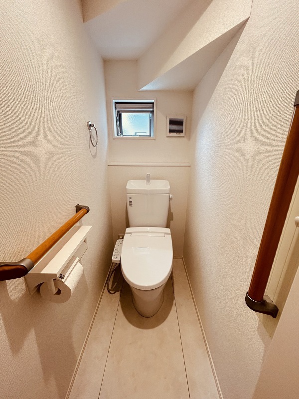 階段下を有効活用したトイレスペース。 便座はもちろんウォシュレット。
