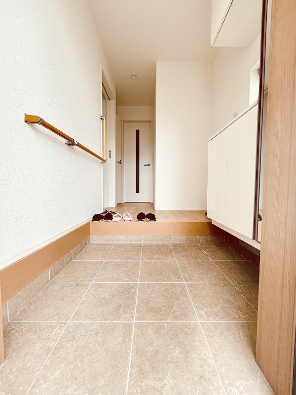 玄関は家の第一印象を左右する重要な場所。ほどよい広さとスタイリッシュな色遣いが印象的です。