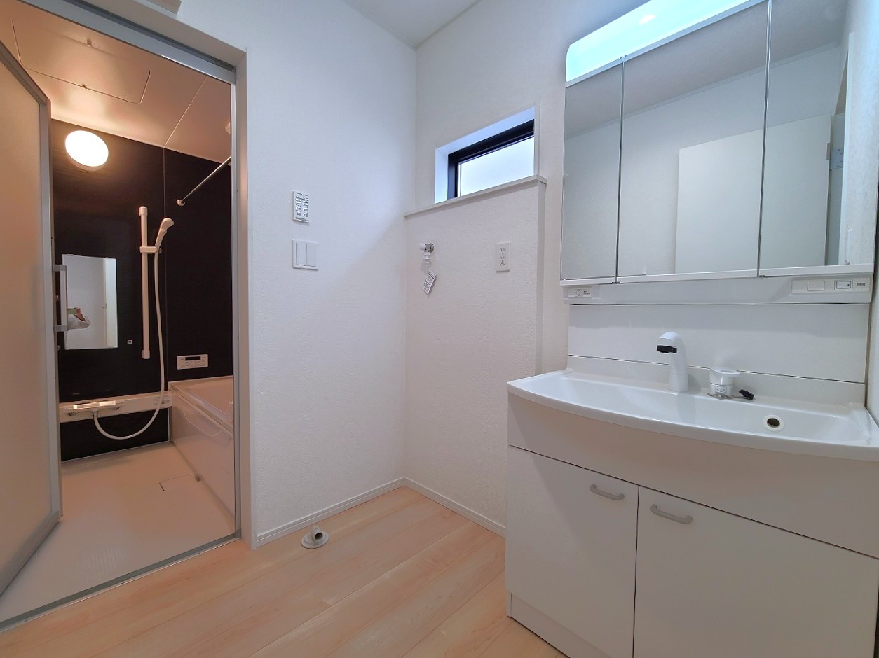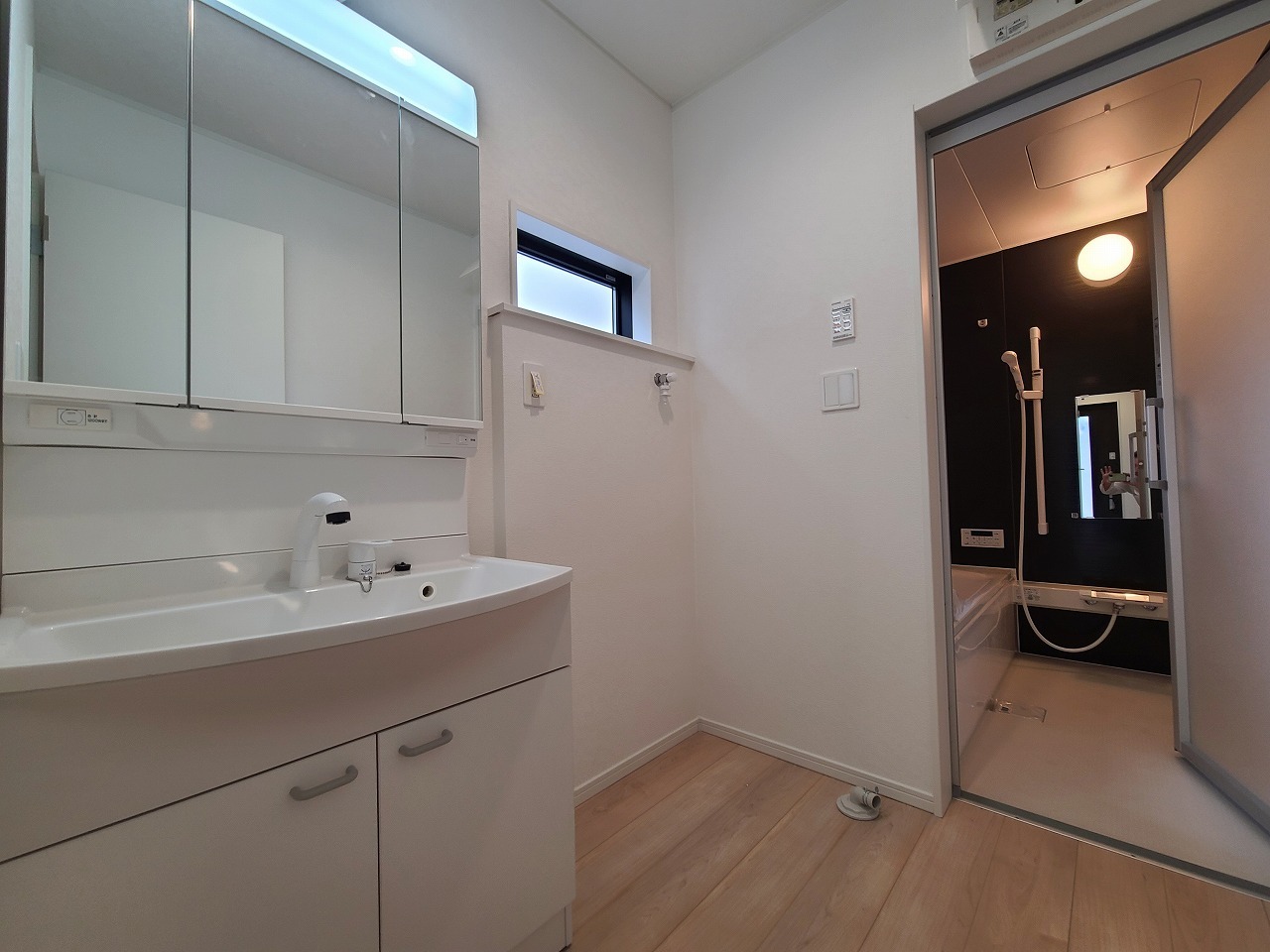 3号棟 使い勝手の良い洗面台、窓があることで換気もしやすく清潔感のある空間を保てます。
