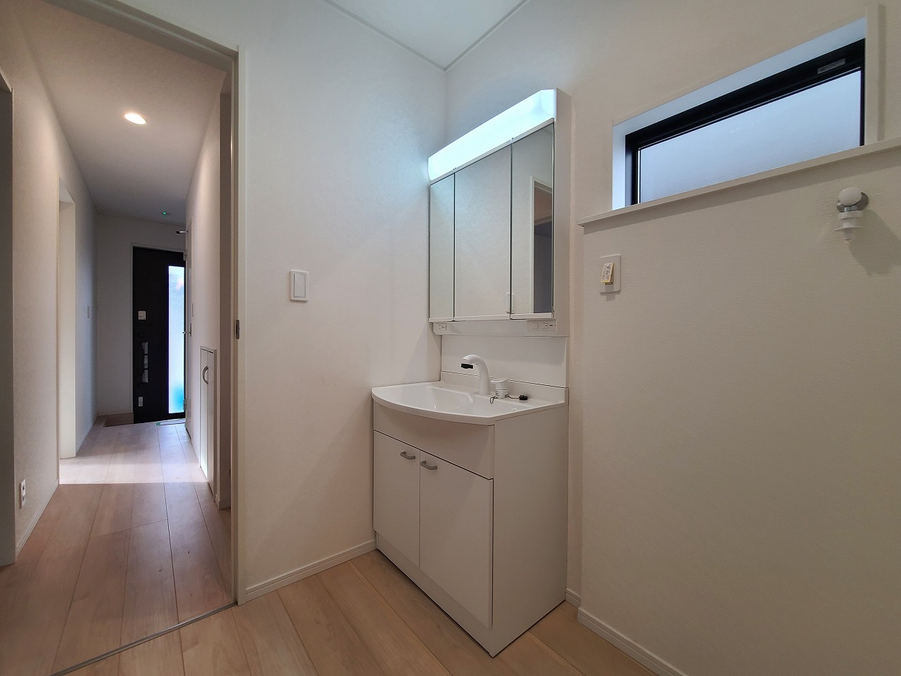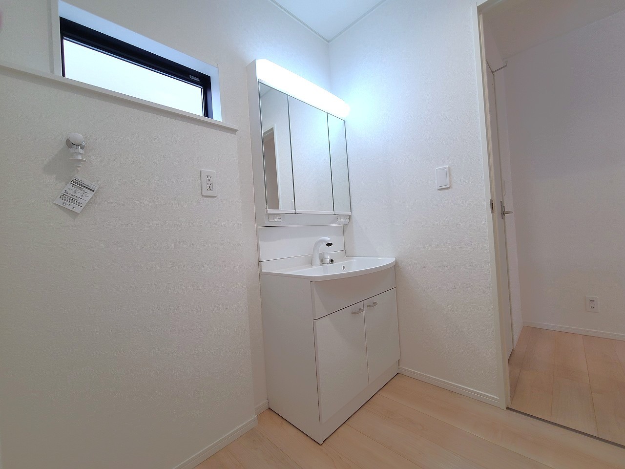 2号棟 使い勝手の良い洗面台、窓があることで換気もしやすく清潔感のある空間を保てます。