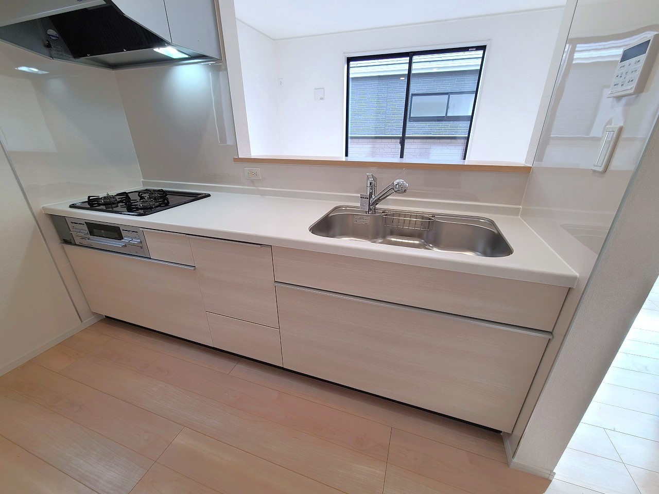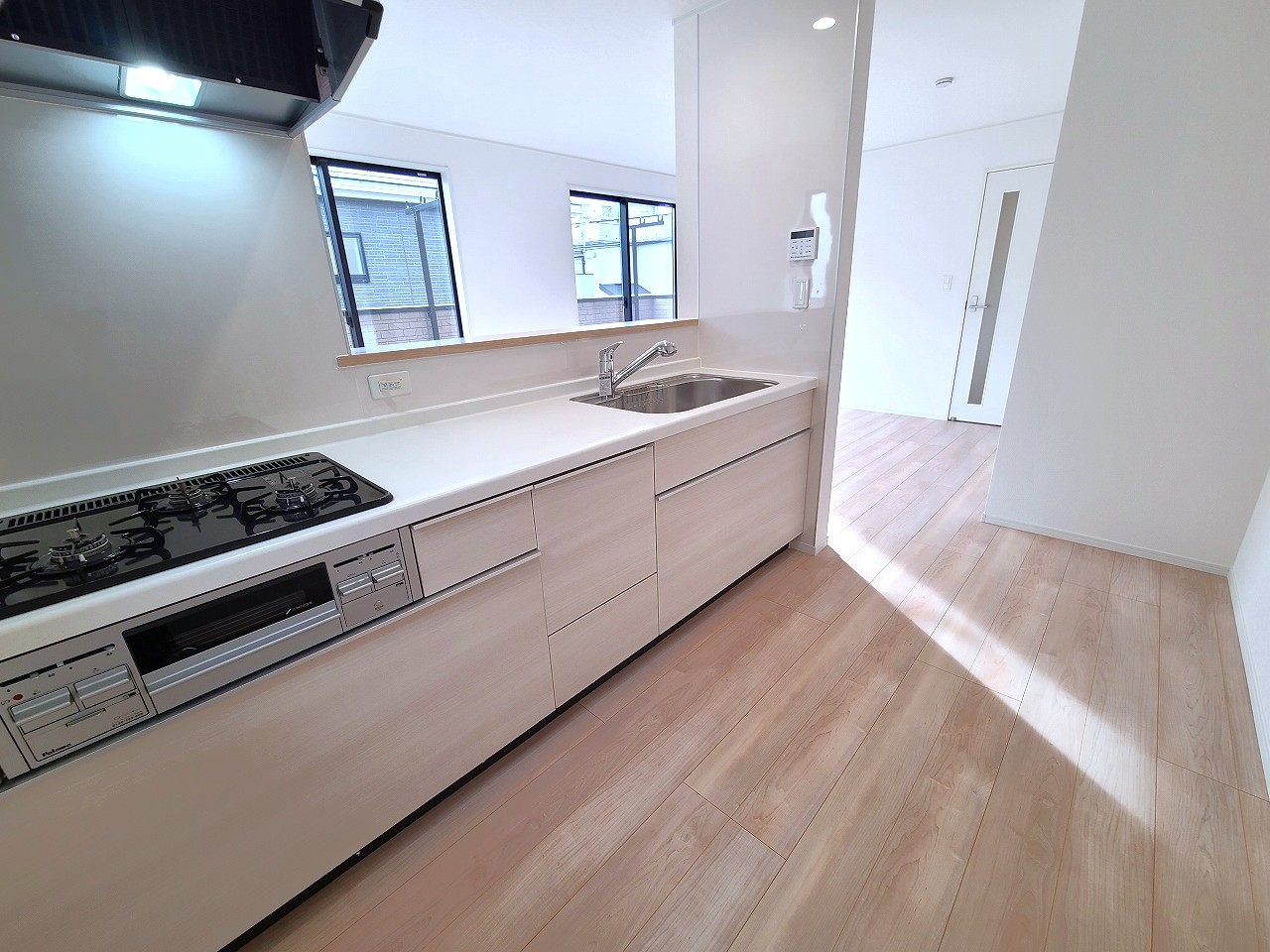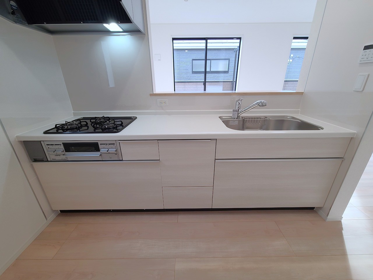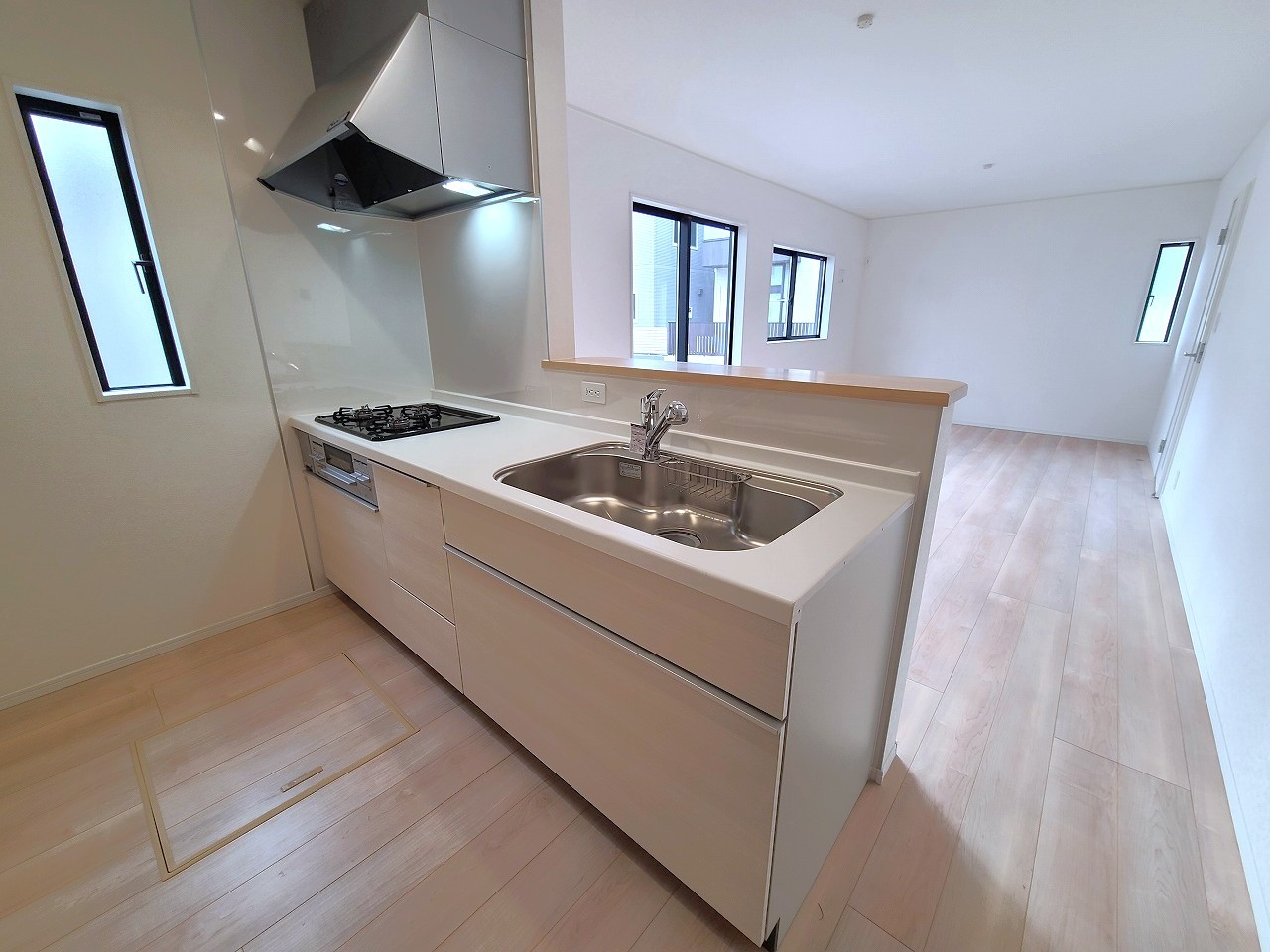 2号棟 リビングにいる家族の顔が見渡せるカウンターキッチン。お料理もより一層おいしく、楽しく。食器棚を背面に設置しても十分な広さを確保しています。