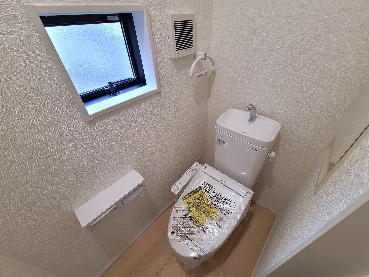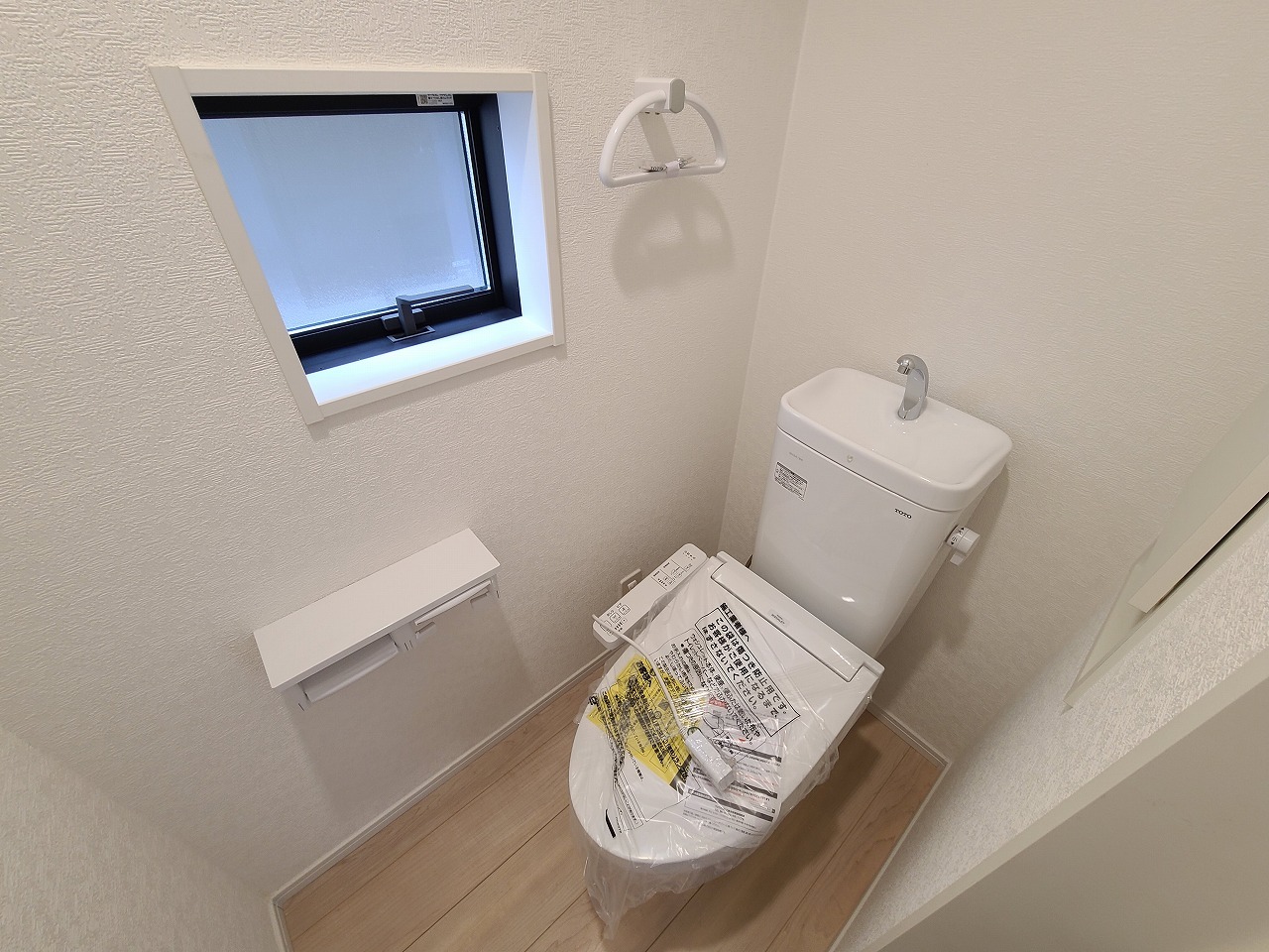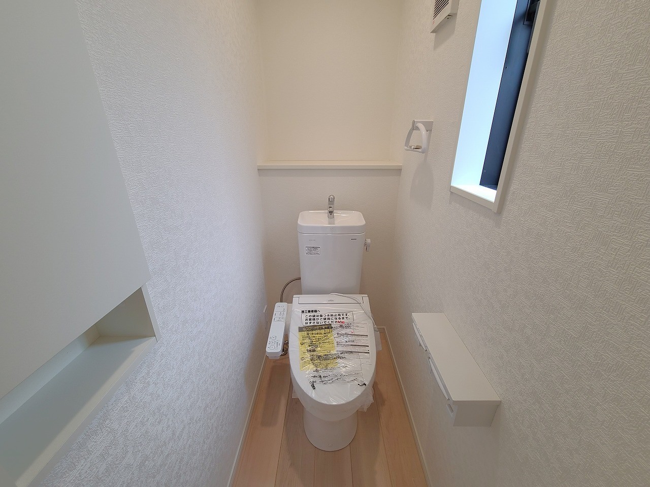 2号棟 ウォシュレット機能付きのトイレ。換気のしやすい窓付きで、収納もあり実用性も兼ね備えた造り。