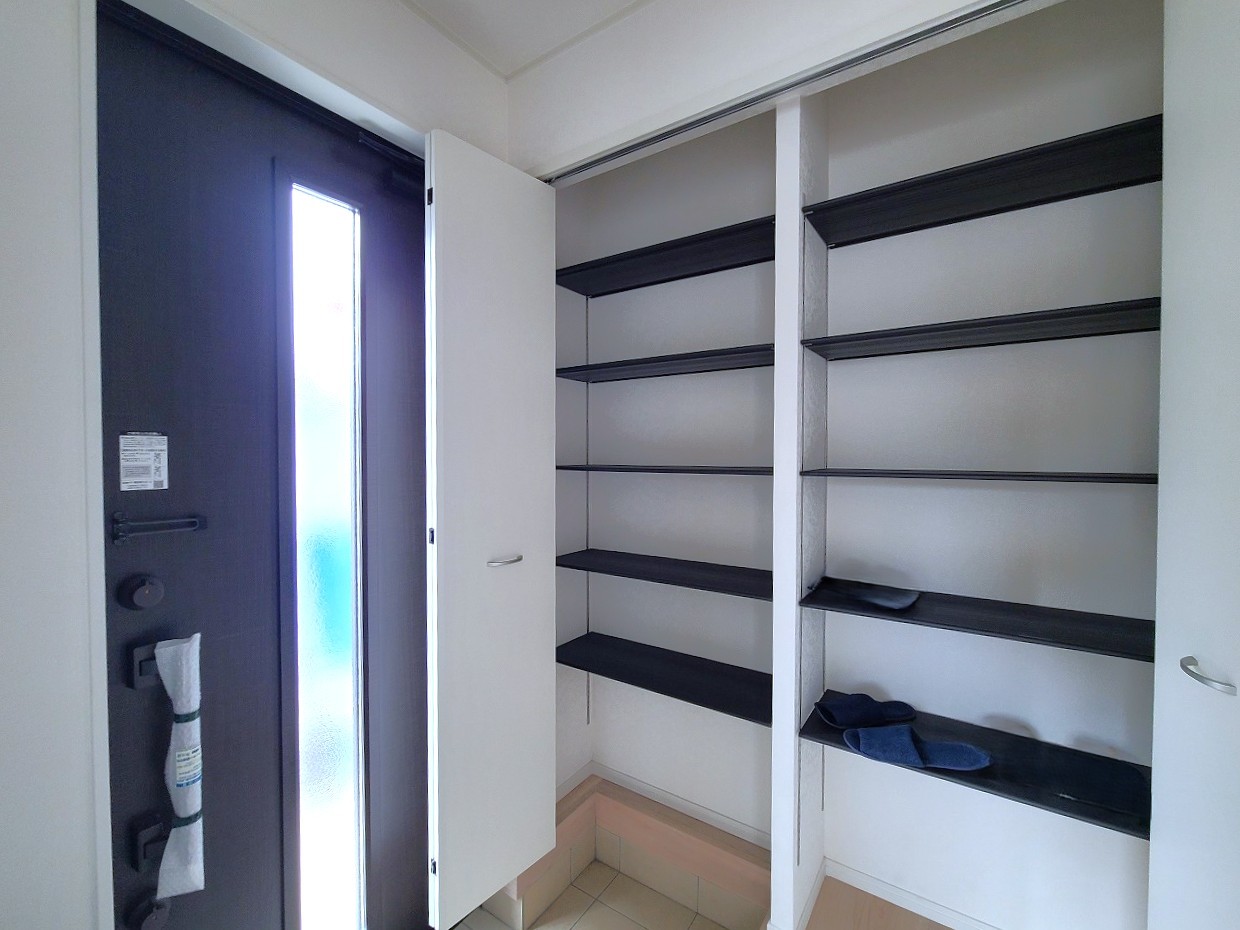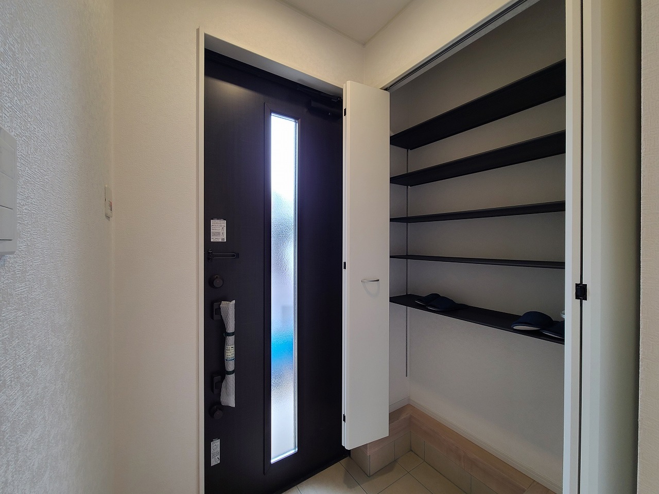 2号棟 明るく開放的な玄関、靴の脱ぎ履きもしやすく、収納も豊富でご家族皆様の靴をスッキリ収納できます。