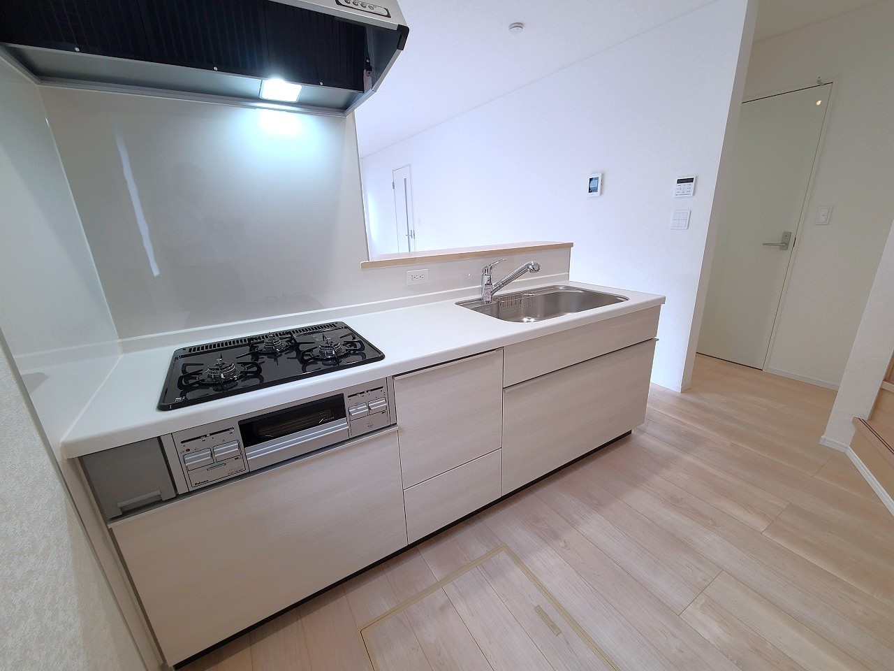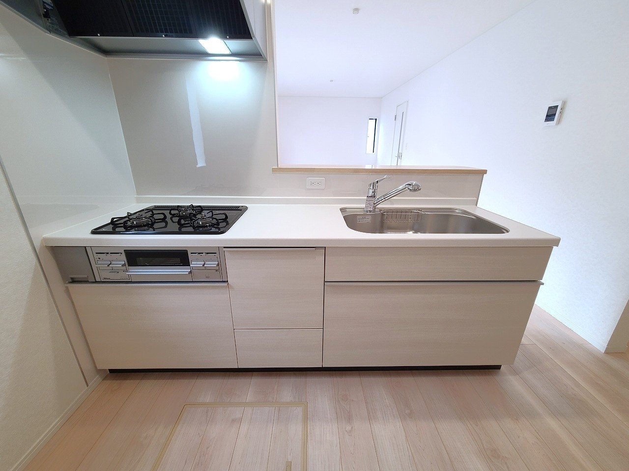 3号棟 リビングにいる家族の顔が見渡せるカウンターキッチン。お料理もより一層おいしく、楽しく。食器棚を背面に設置しても十分な広さを確保しています。
