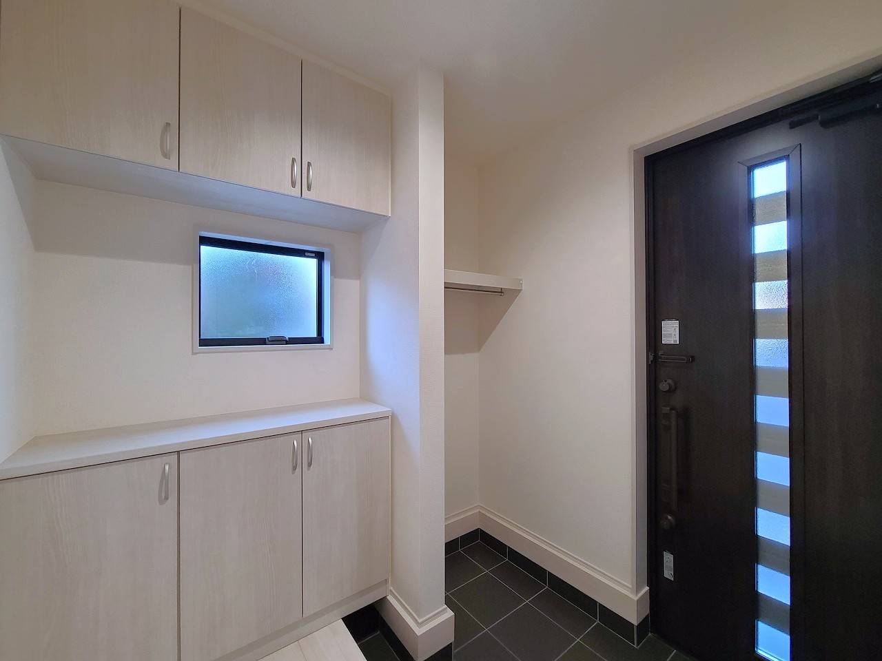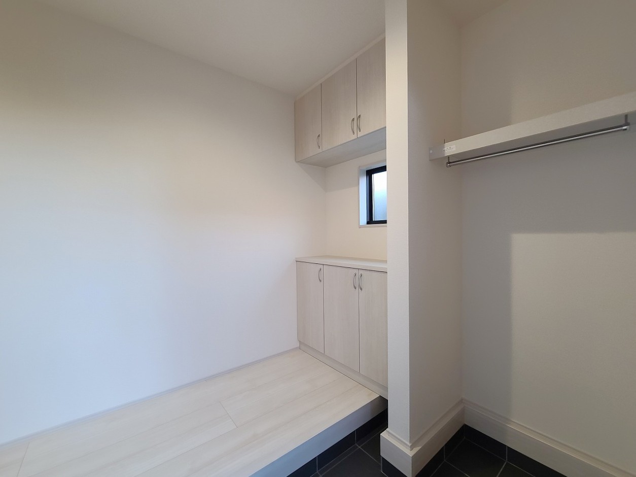 2号棟 明るく開放的な玄関、靴の脱ぎ履きもしやすく、収納も豊富でご家族皆様の靴をスッキリ収納できます。