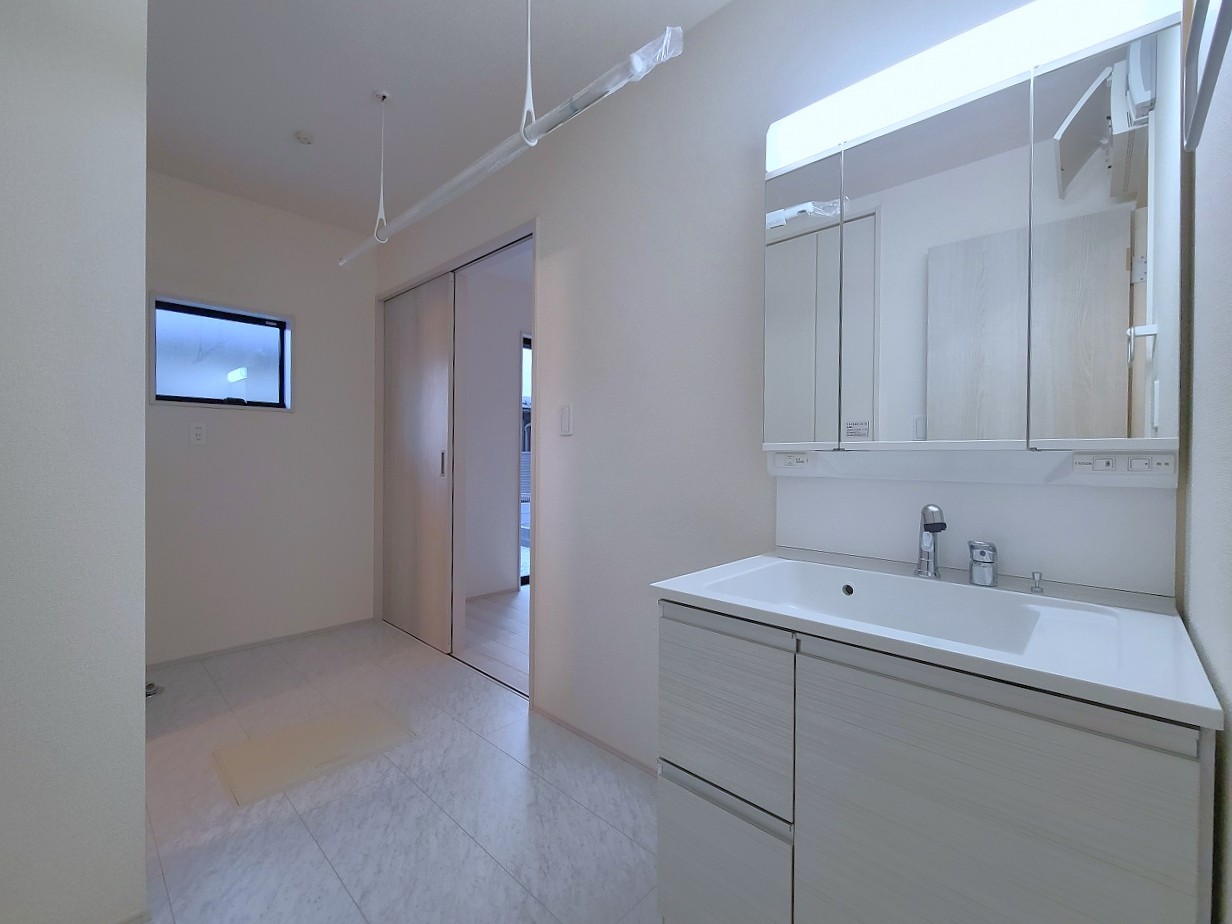 2号棟 使い勝手の良い洗面台、窓があることで換気もしやすく清潔感のある空間を保てます。