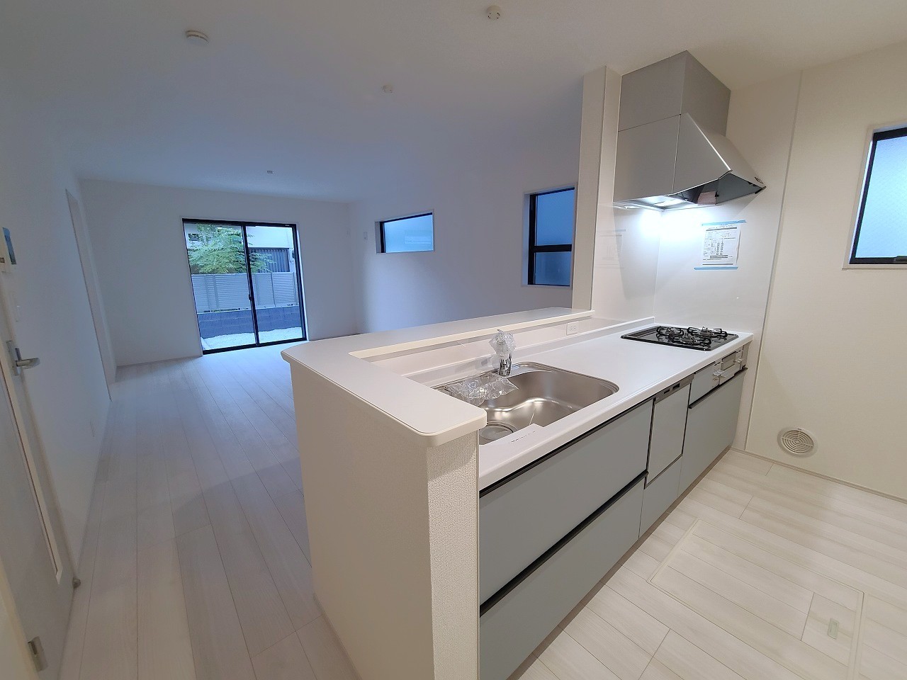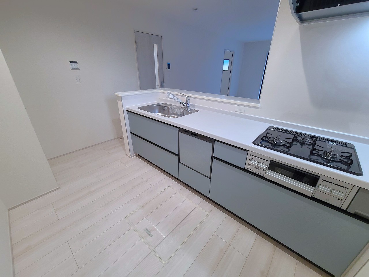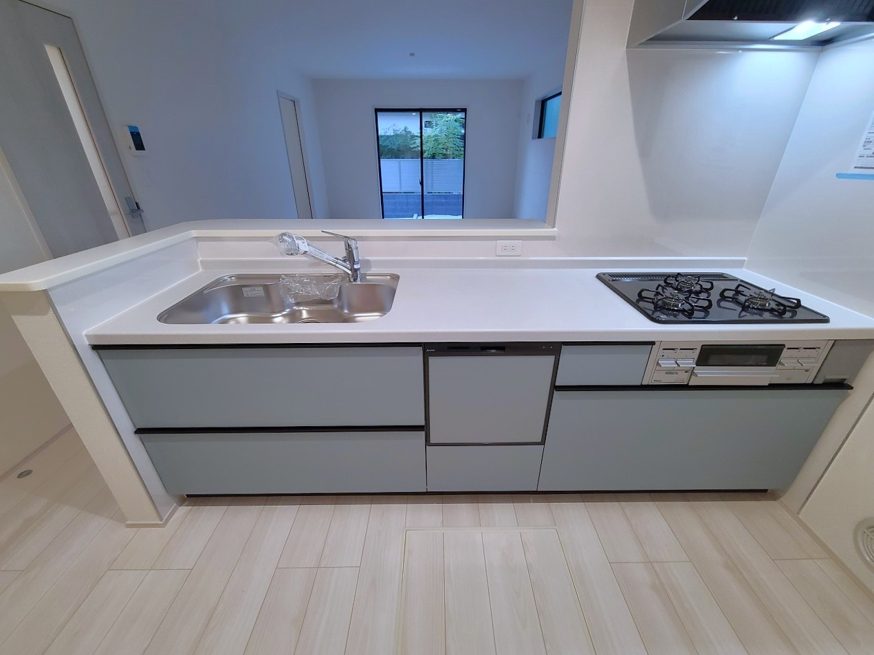 2号棟 リビングにいる家族の顔が見渡せるカウンターキッチン。お料理もより一層おいしく、楽しく。食器棚を背面に設置しても十分な広さを確保しています。