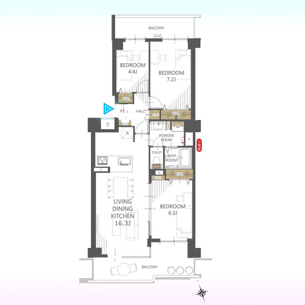 | 間取 | 3LDK (LDK16.3帖、洋室7.2帖、洋室6.3帖、洋室4.4帖) | ||