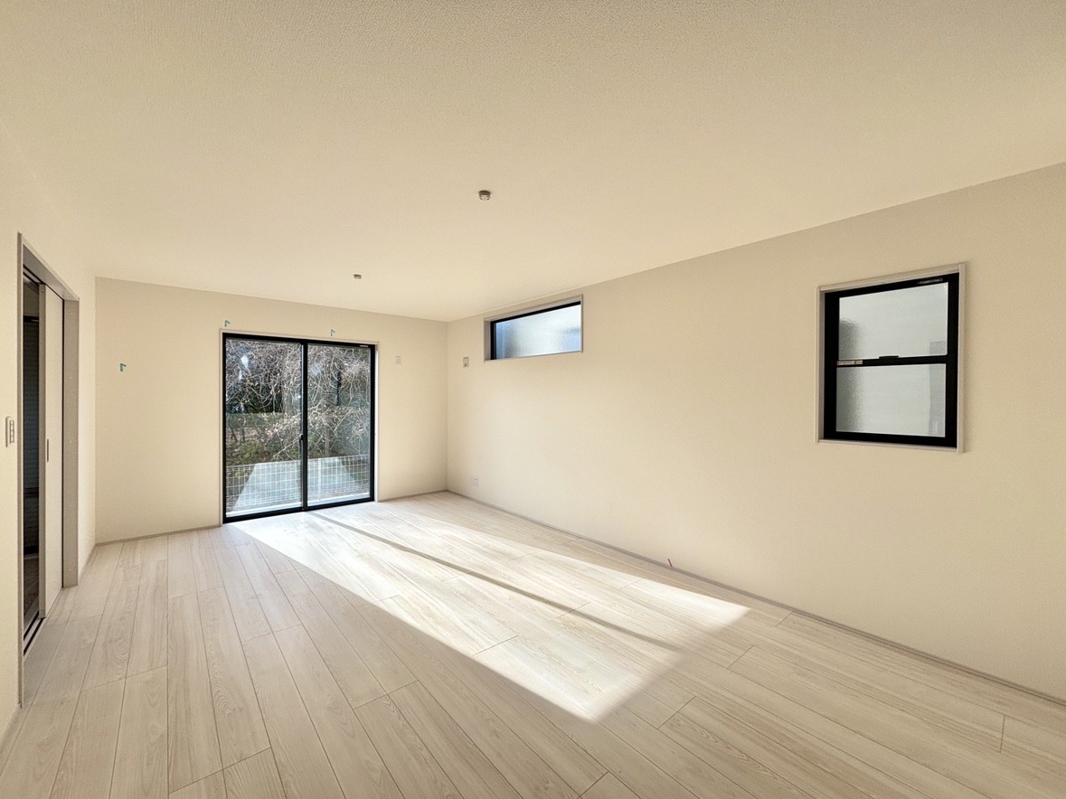 2号棟 家族や友人、両親、親戚とこれから沢山の時間を紡ぐのだろう。そこを彩るのは窓から見える青い空、心地よい緑。そんなイメージが膨らむリビングスペース。