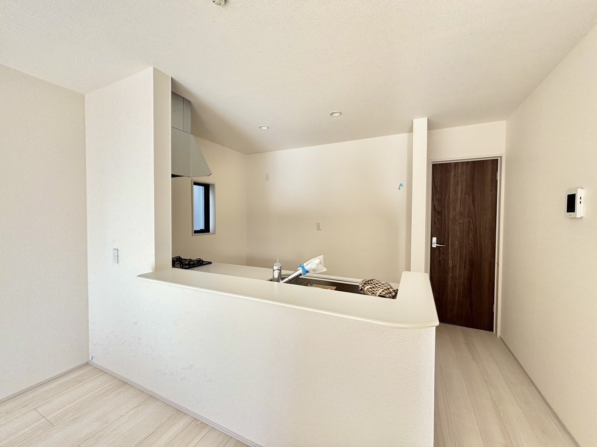 2号棟 リビングにいる家族の顔が見渡せるカウンターキッチン。お料理もより一層おいしく、楽しく。食器棚を背面に設置しても十分な広さを確保しています。