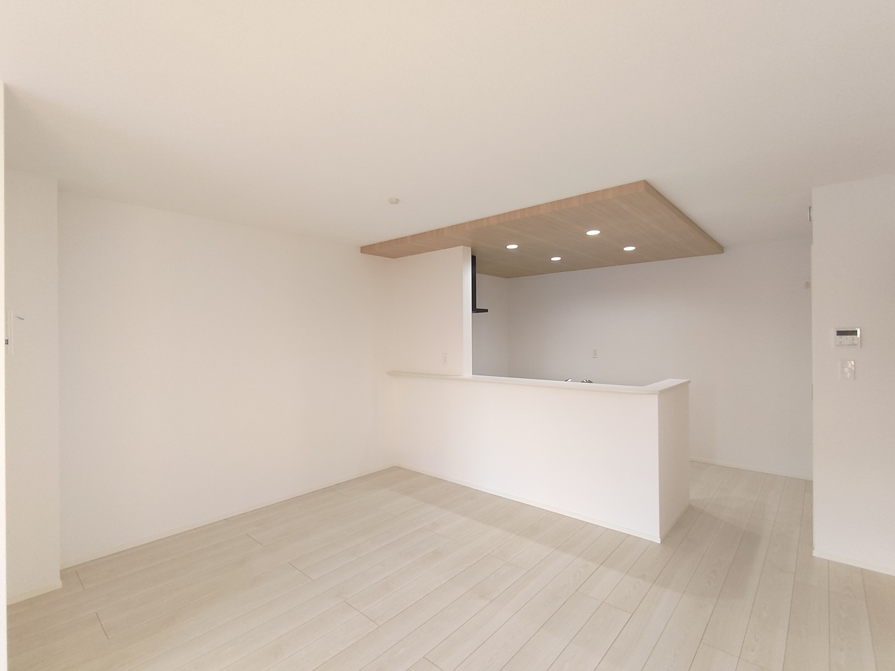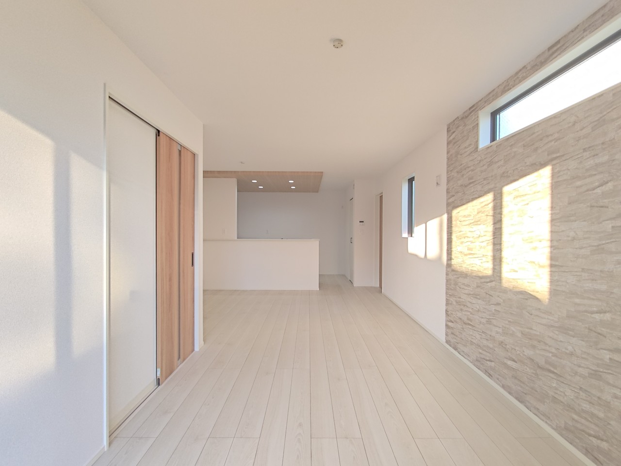 【LDK/約18.25帖】 家族や友人、両親、親戚とこれから沢山の時間を紡ぐのだろう。そこを彩るのは窓から見える青い空、心地よい緑。そんなイメージが膨らむリビングスペース。