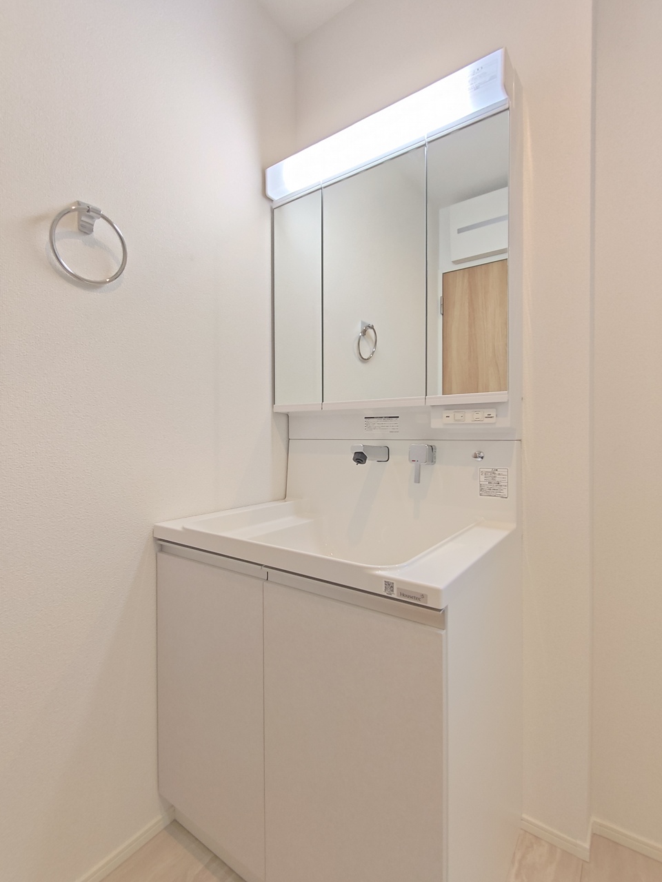 収納付きの洗面化粧台。鏡の裏側も収納棚になっています。