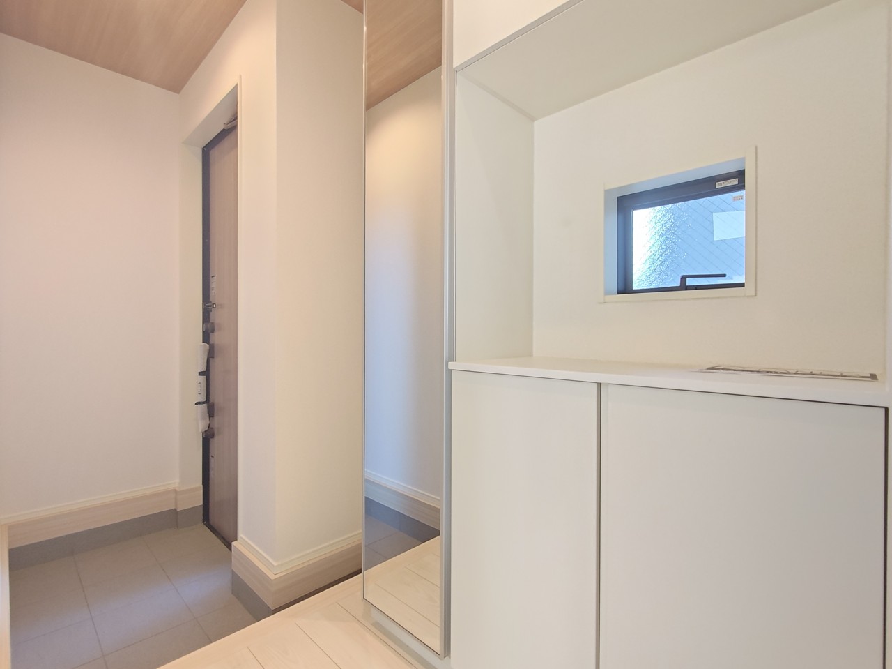 大きな靴棚を配した玄関ホール。靴棚に設置した姿見鏡はお出かけ前の身だしなみチェックにお役立てください!