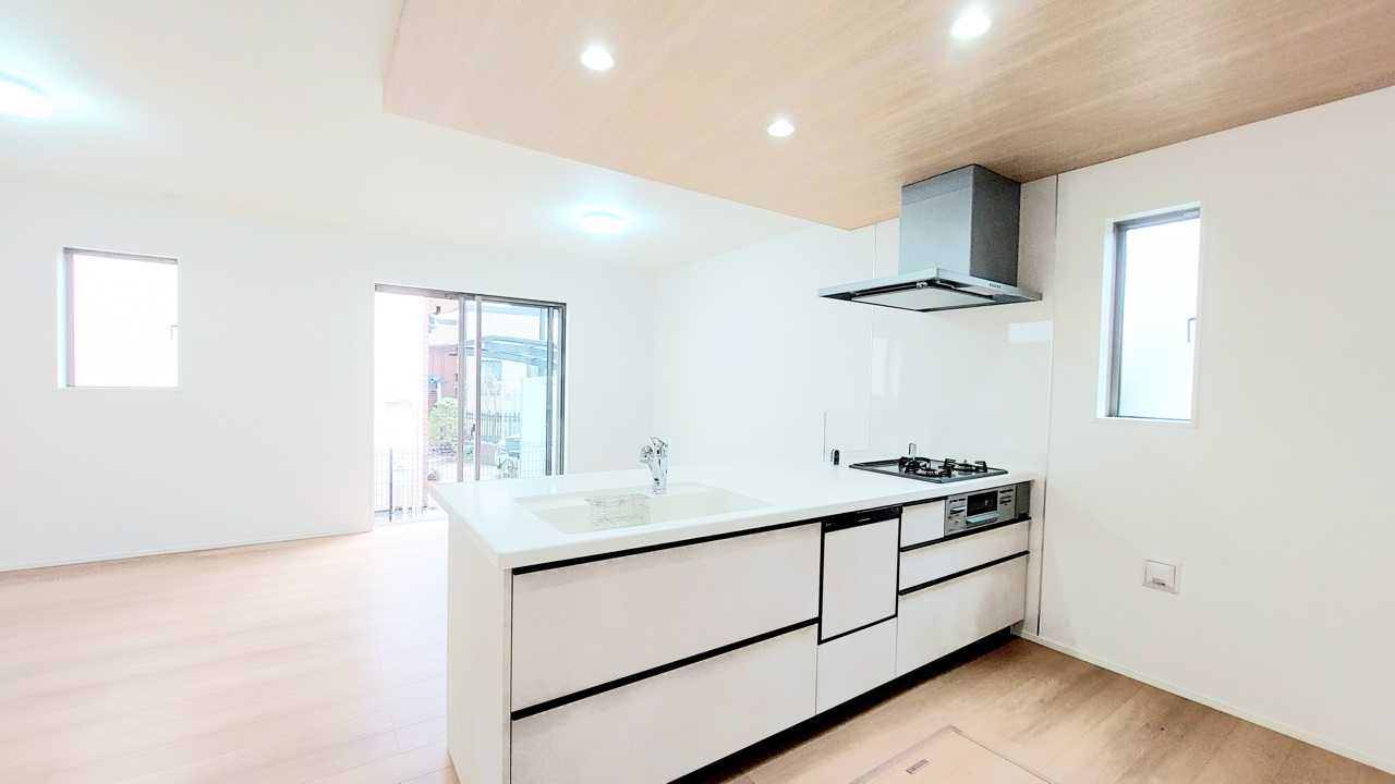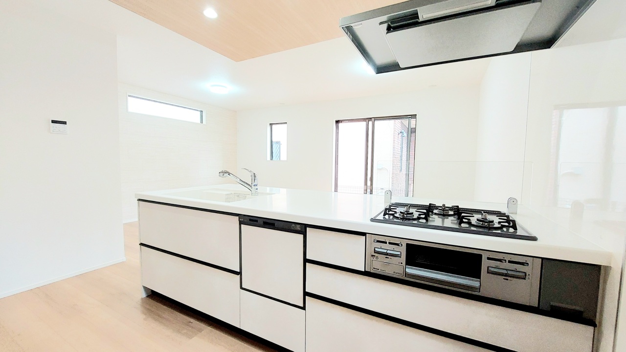 1号棟 時短に活躍する食器洗浄機や一杯の水も楽しめる浄水器があるシステムキッチン。