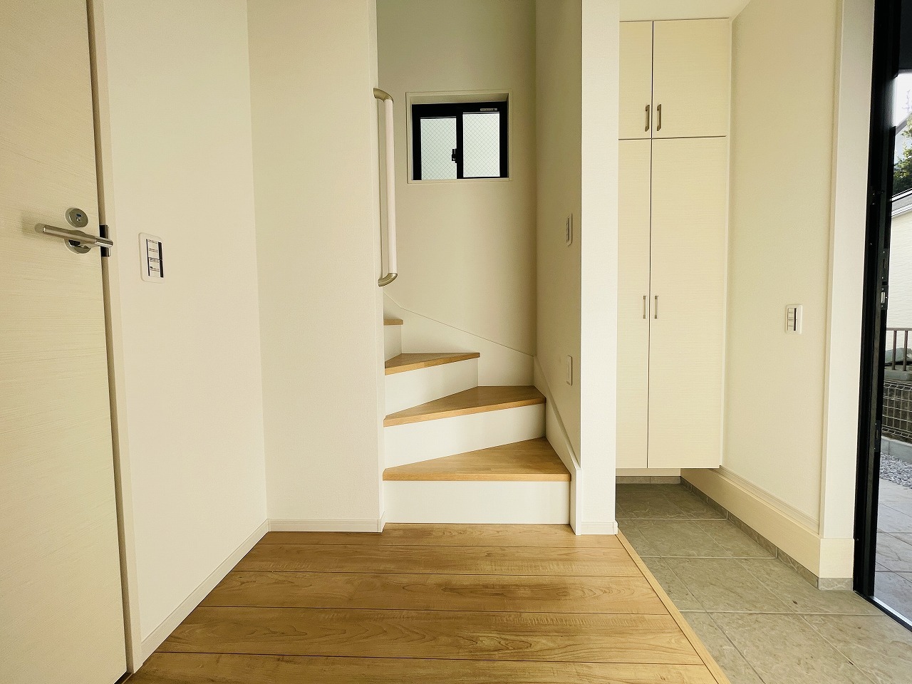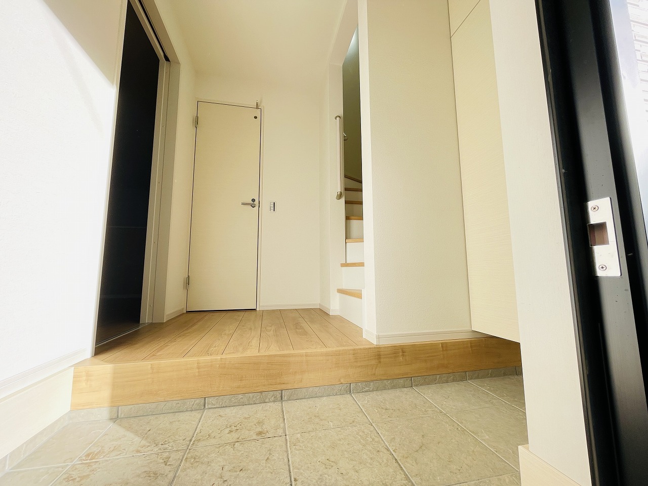 玄関は家の第一印象を左右する重要な場所。ほどよい広さとスタイリッシュな色遣いが印象的です。