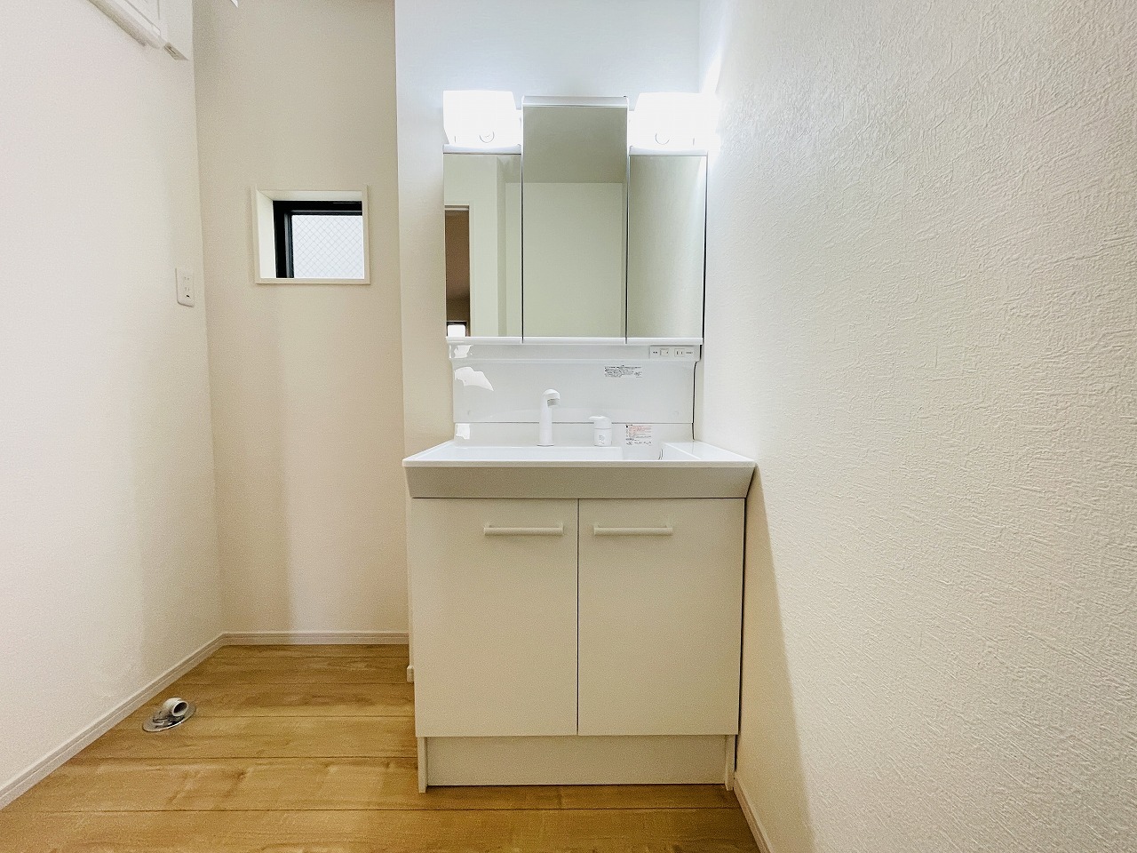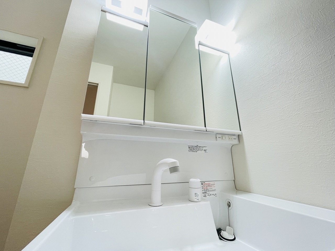 三面鏡に洗面台。 コンセントに照明機能、多機能性を備えた設備です。