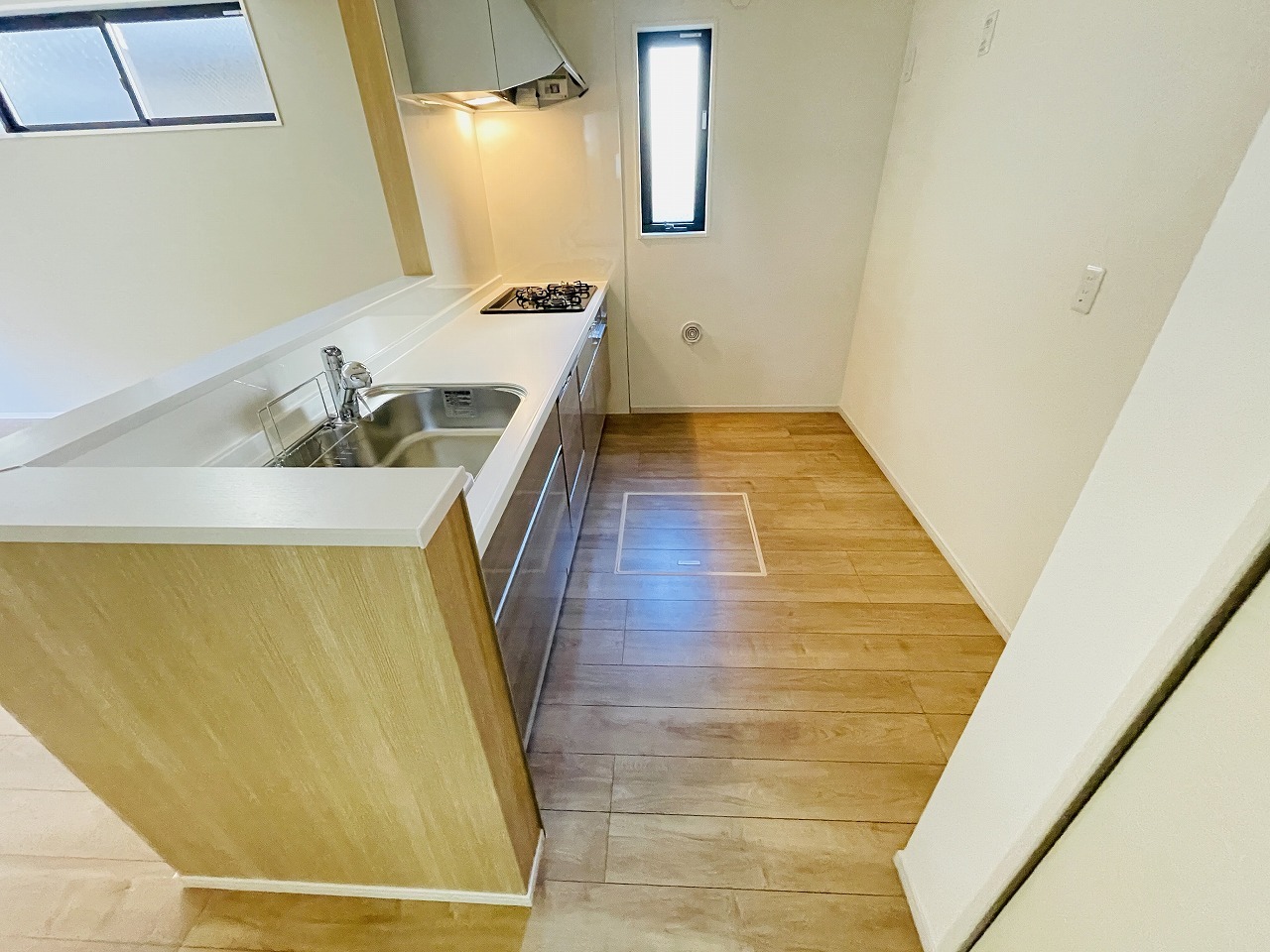 キッチンコンロスペースの近くには、空気の入れ替えが可能な開口部を設置!! お料理をする際には、換気扇を回しながら匂いが籠らない様に開放してお料理もお楽しみ頂けます。