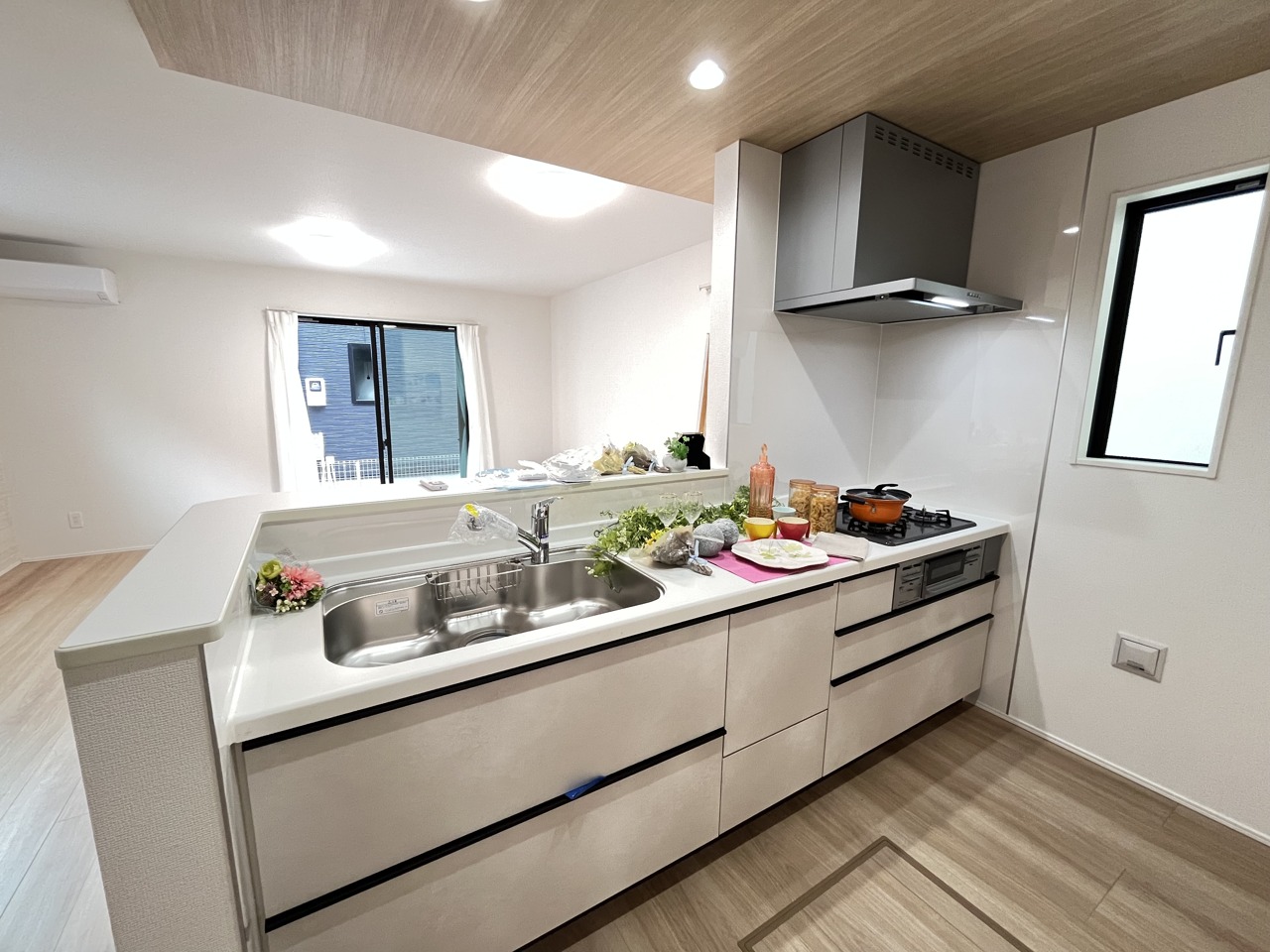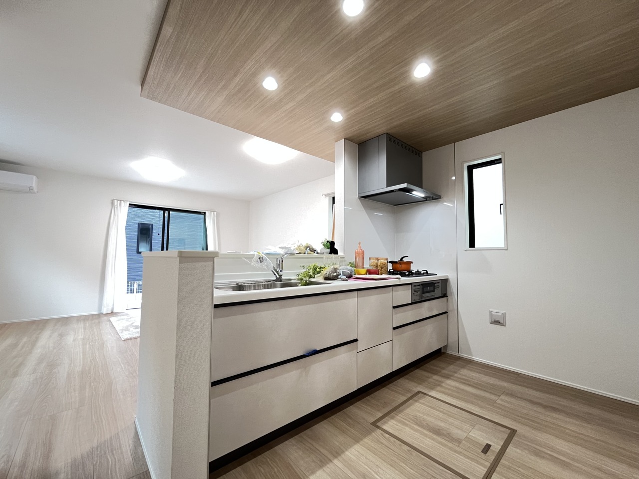 リビングにいる家族の顔が見渡せるカウンターキッチン。お料理もより一層おいしく、楽しく。食器棚を背面に設置しても十分な広さを確保しています。
