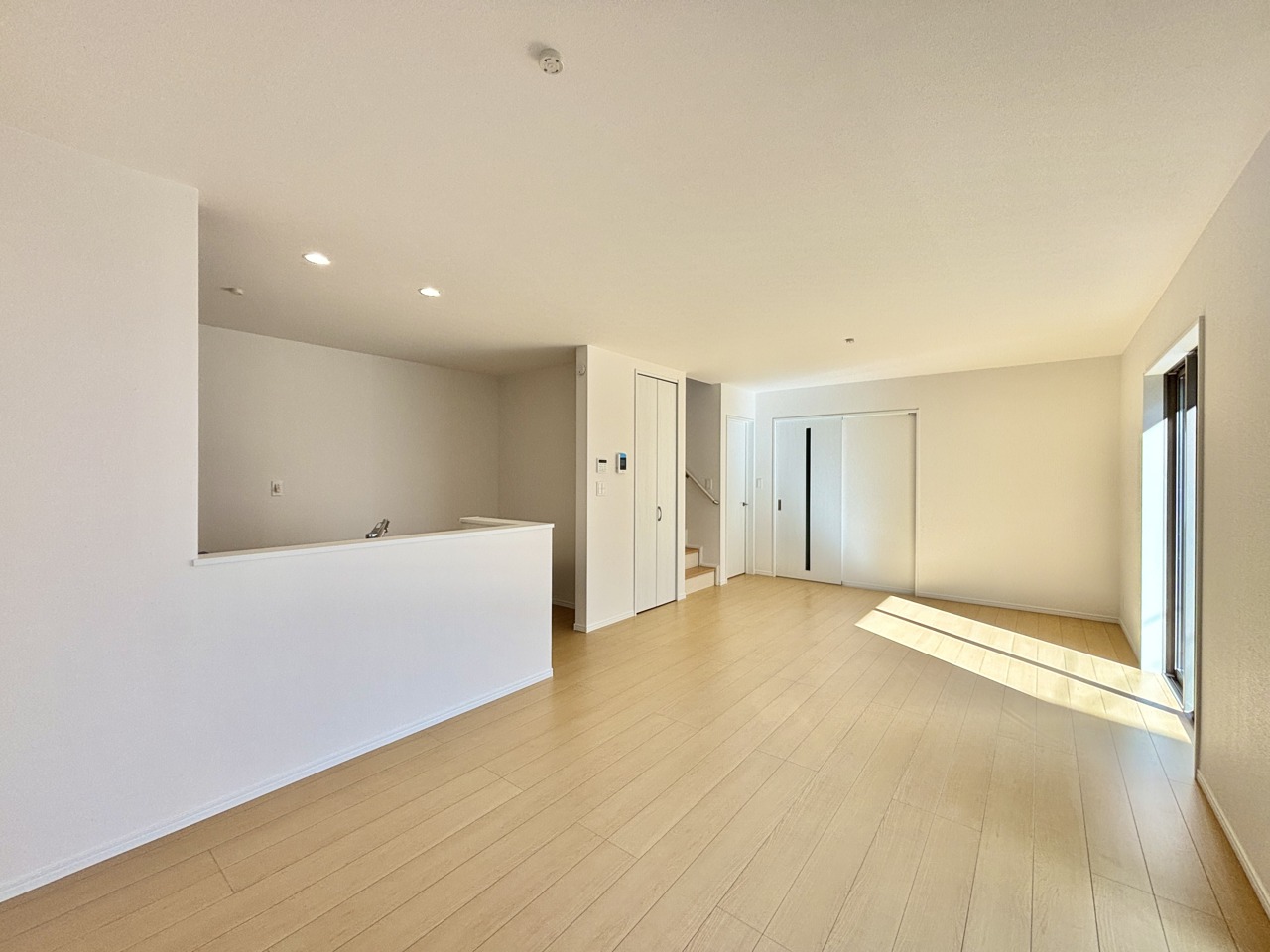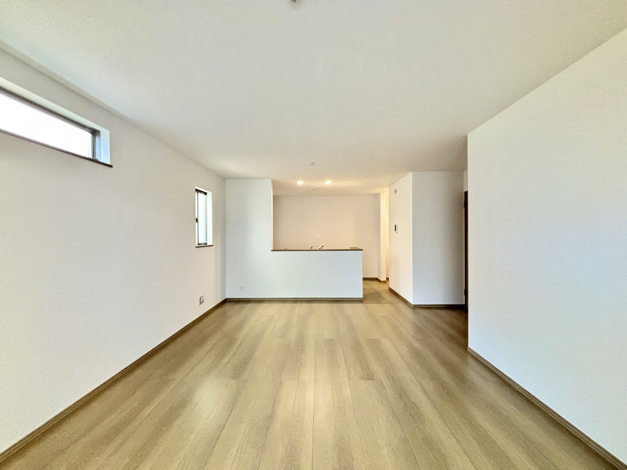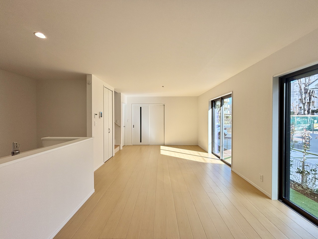 B号棟 家族や友人、両親、親戚とこれから沢山の時間を紡ぐのだろう。そこを彩るのは窓から見える青い空、心地よい緑。そんなイメージが膨らむリビングスペース。 2026/01/29m