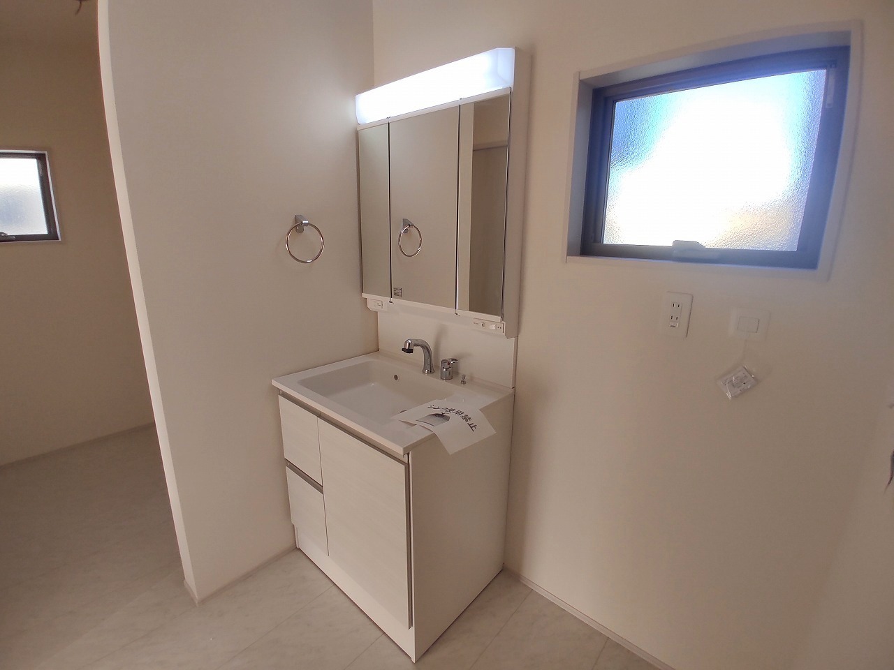 三面鏡を採用した洗面化粧台。鏡の裏にも収納スペースがあります。