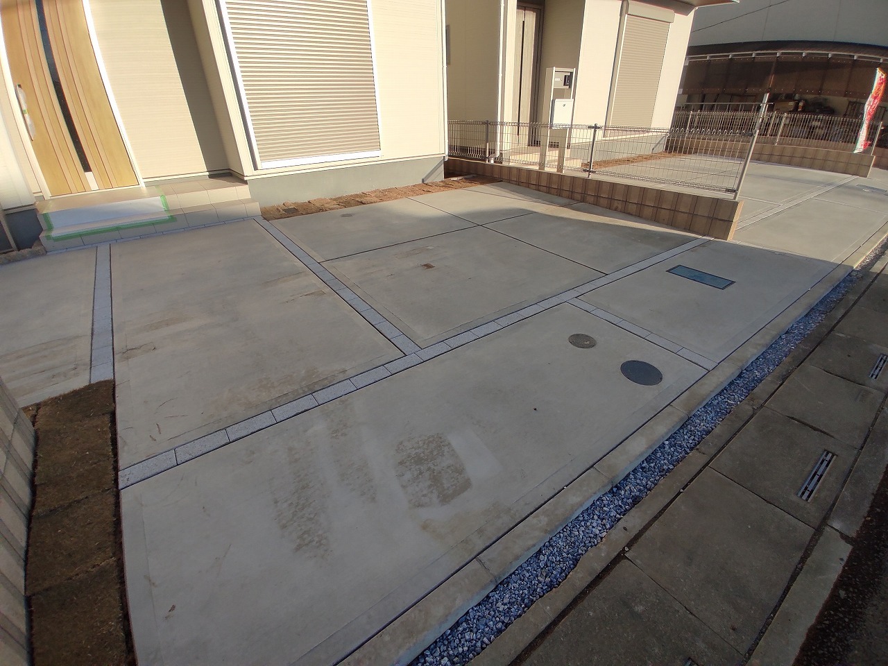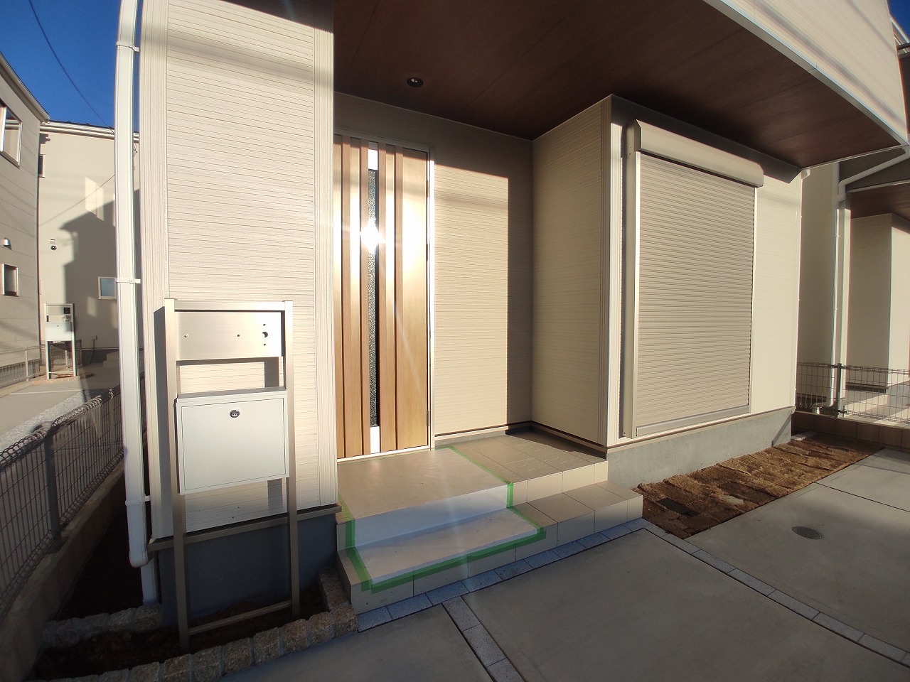 ポーチのついた新築分譲物件。玄関の印象はいかがでしょうか?入口からご覧ください。