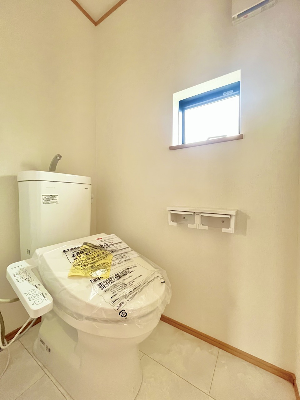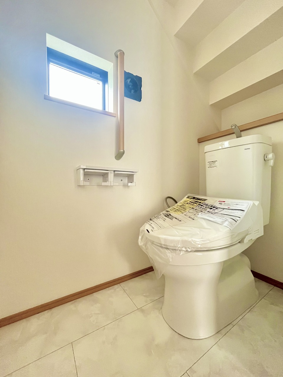 ウォシュレット機能付きのトイレ。換気のしやすい窓付きで、収納もあり実用性も兼ね備えた造り。