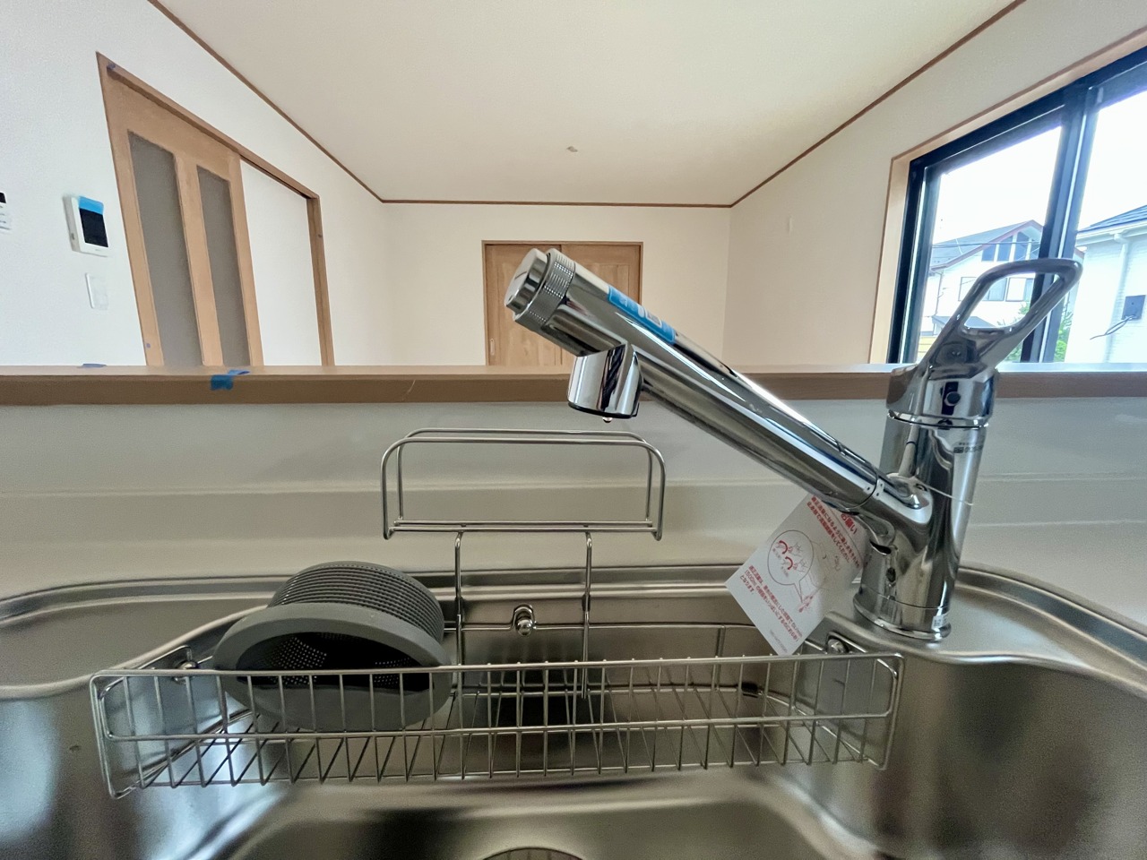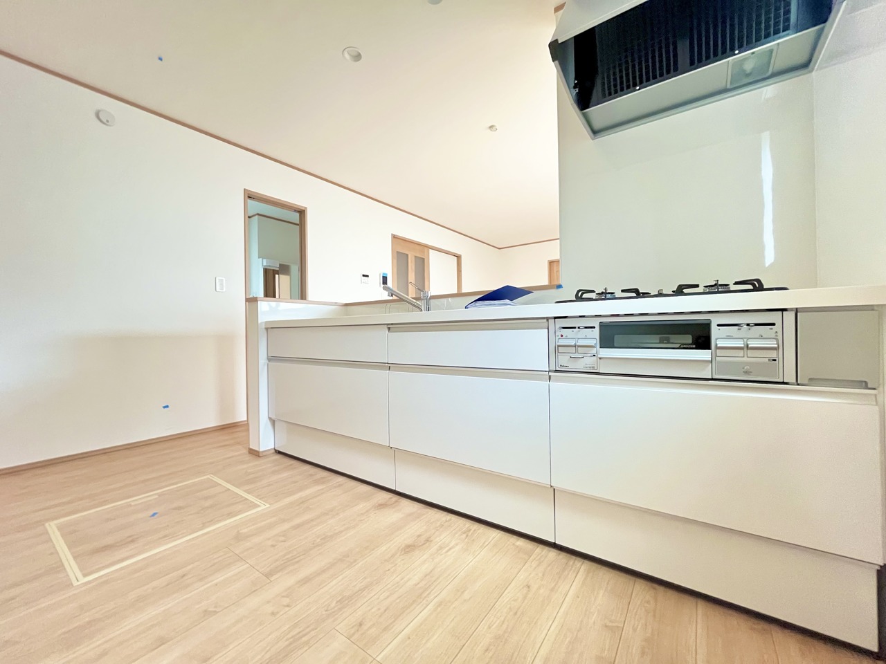 リビングにいる家族の顔が見渡せるカウンターキッチン。お料理もより一層おいしく、楽しく。食器棚を背面に設置しても十分な広さを確保しています。