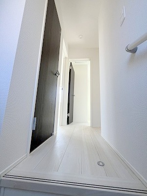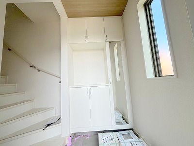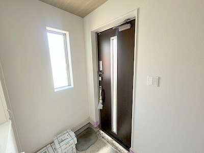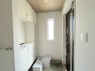 誰も住んだことのない家の玄関スペース。あたらしい木のにおいを感じていただけると思います。