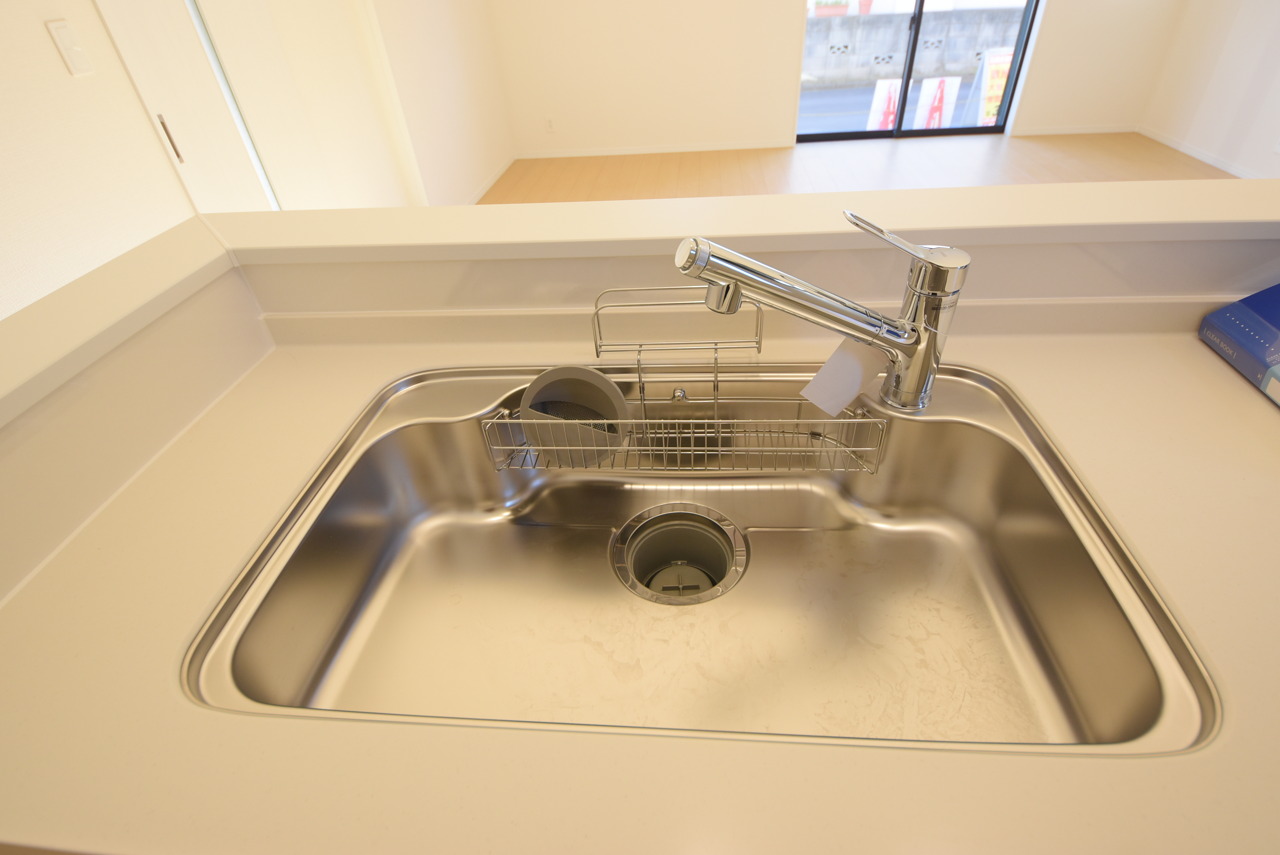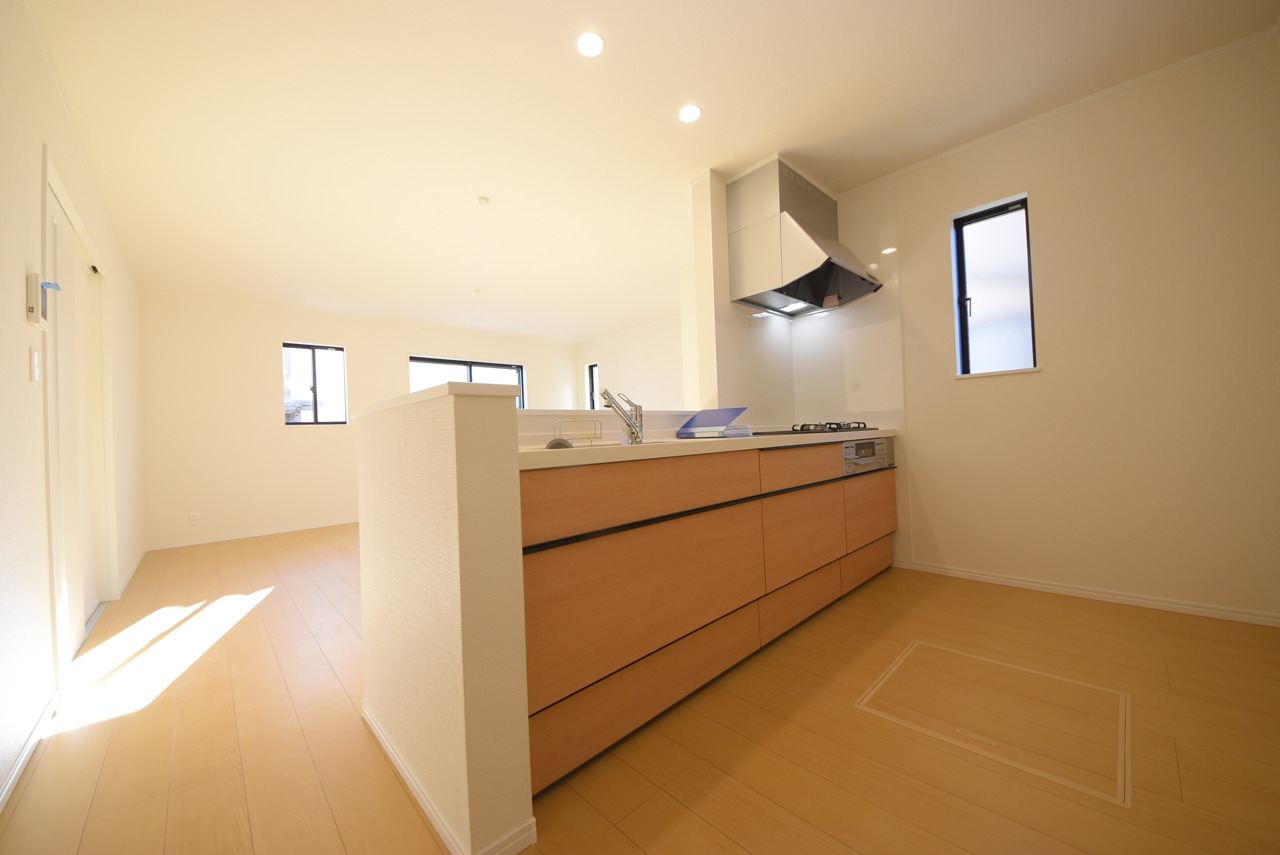 リビングにいる家族の顔が見渡せるカウンターキッチン。お料理もより一層おいしく、楽しく。食器棚を背面に設置しても十分な広さを確保しています。