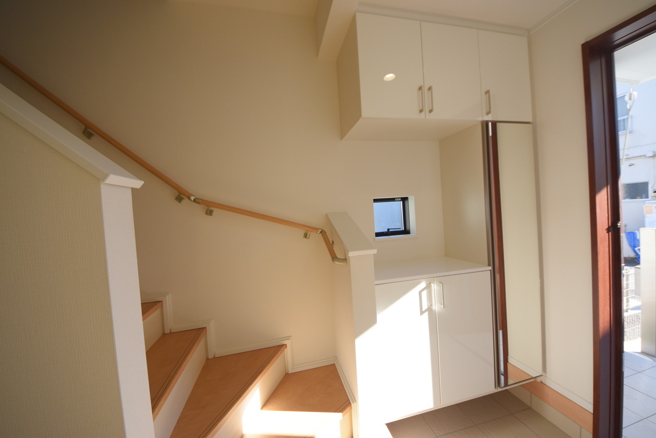 お宅の顔となる明るく開放的な玄関。ご家族皆様様の靴を収納できるスペースと全身鏡があり、お出掛け前に身だしなみチェックもできます。