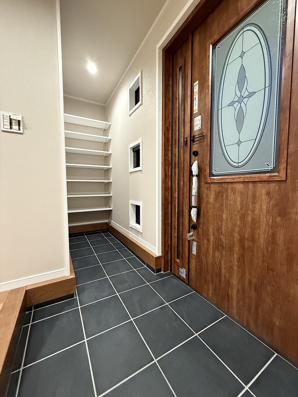 明るく広々とした玄関は、家に入る瞬間から心地よい居心地を感じさせます。シューズインクローゼットも完備して収納もタップリ。