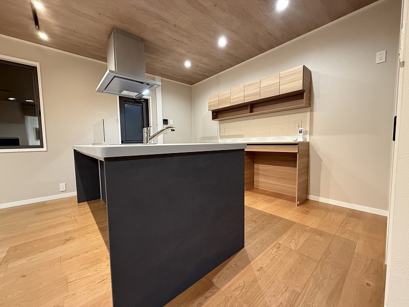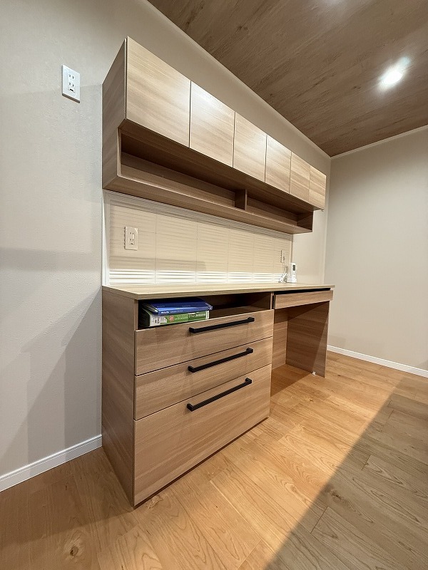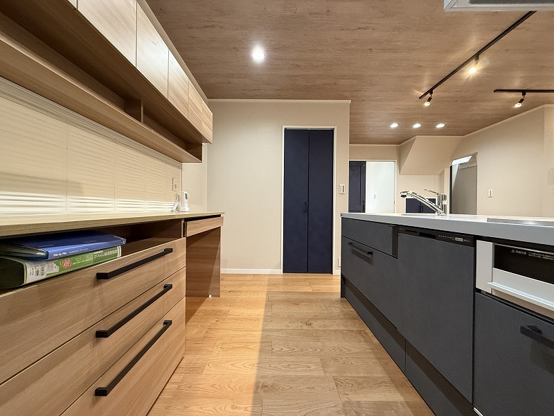 カウンターキッチンの背面には備え付けの食器棚新規設置。 キッチンの色合いとのコントラストの調和もとれてます。