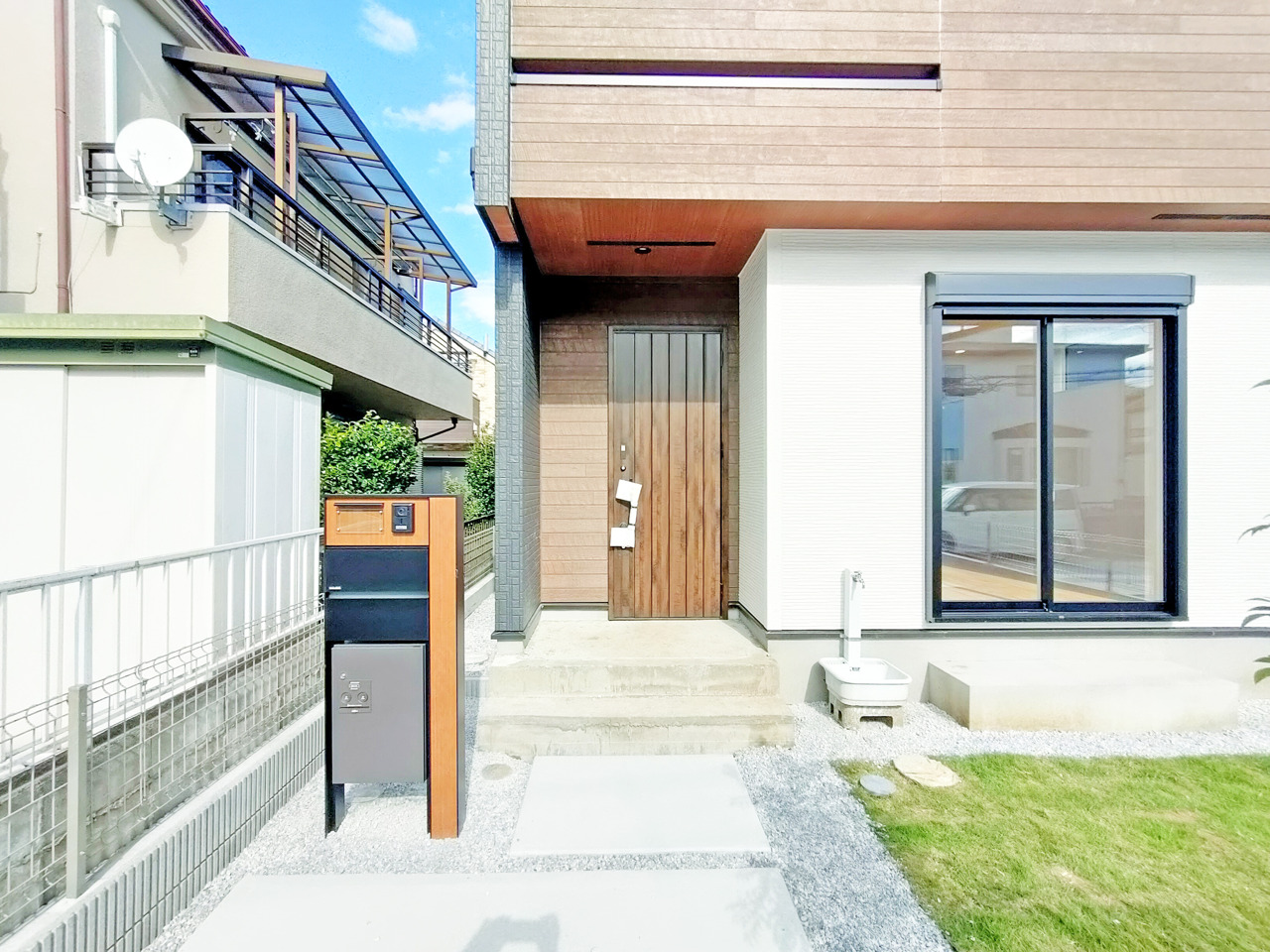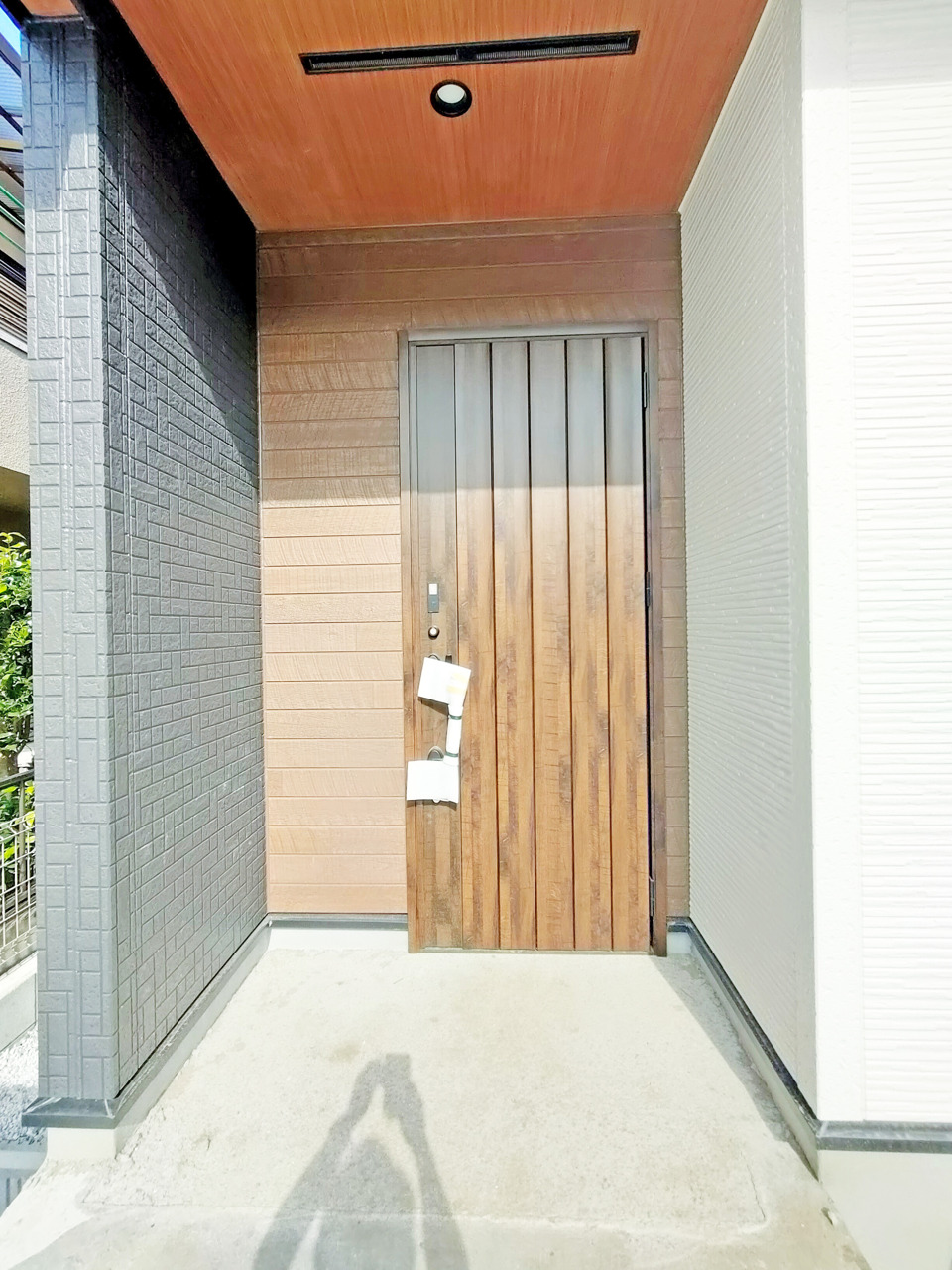ポーチのついた新築分譲物件。玄関の印象はいかがでしょうか?入口からご覧ください。