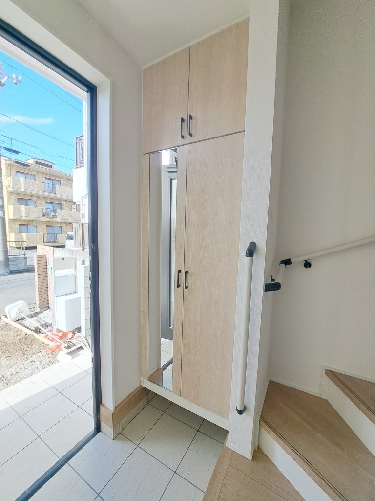 コンパクトながらも、使い勝手の良い玄関スペース。明るいデザインと、収納スペースを効果的に配置することで、使い勝手を最大限に引き出しています。