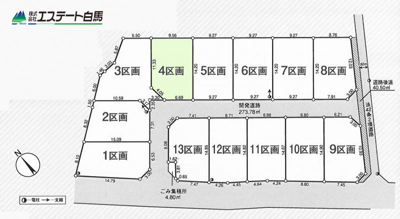 | 備考・制限等 | ゴミ置場持分4.8平米の内1/13有、開発許可番号指令第2025-0150号(開発許可変更番号指令第2025-0151番)、航空法、景観法 農地法、地目一部公衆用道路、水道負担金は買主様負担、高圧電線路下に該当するため建物の高さ制限あり、開発道路とセットバック部分は市に採納予定、 | ||