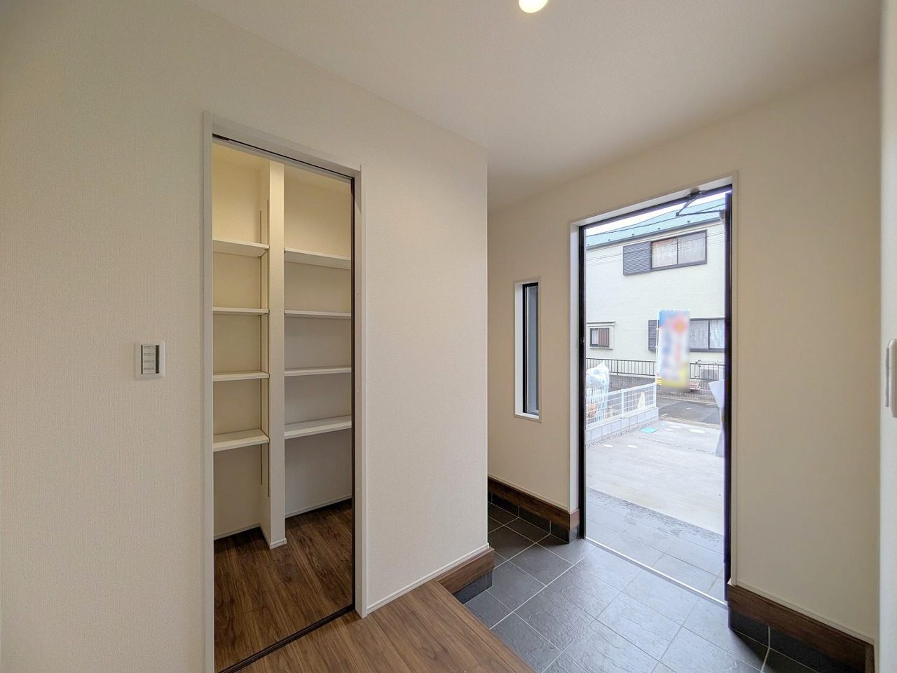 2号棟 玄関横にシューズインクローク付き、雨具や三輪車を置いても余裕の広さ。