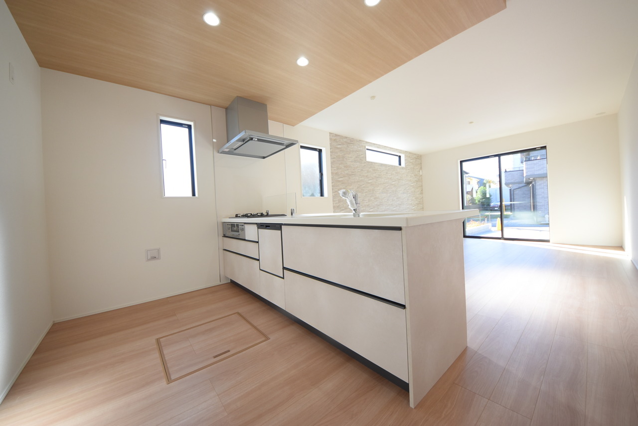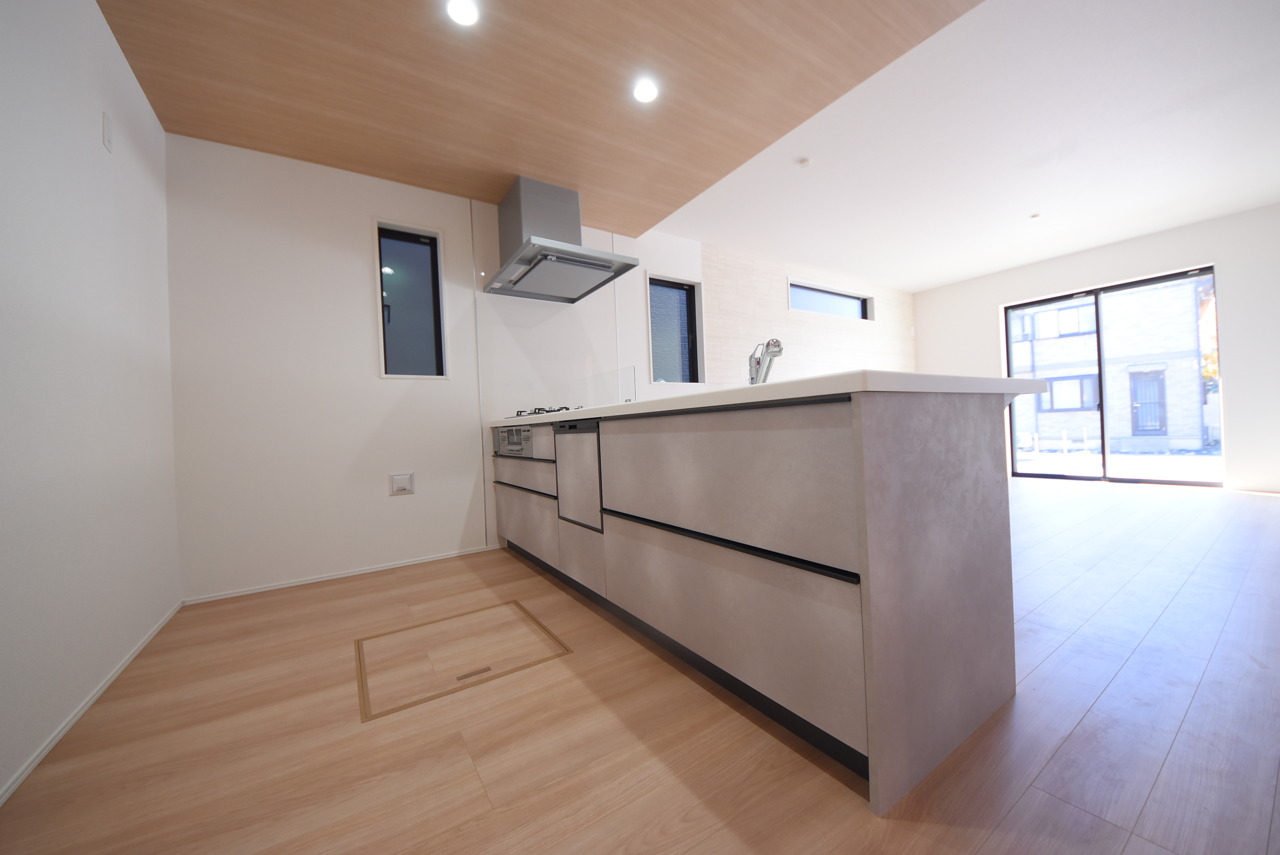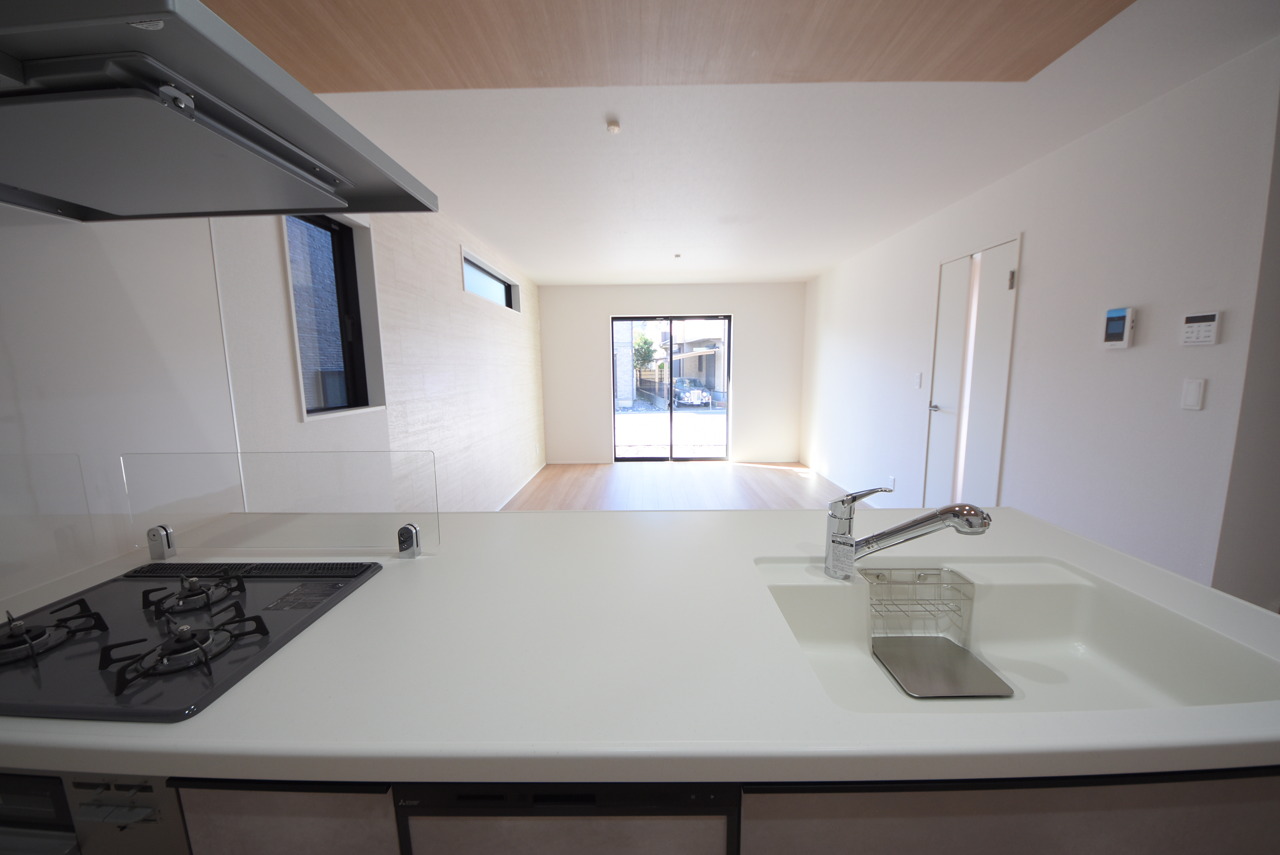 1号棟 リビングにいる家族の顔が見渡せるカウンターキッチン。お料理もより一層おいしく、楽しく。食器棚を背面に設置しても十分な広さを確保しています。 2025/11/28m