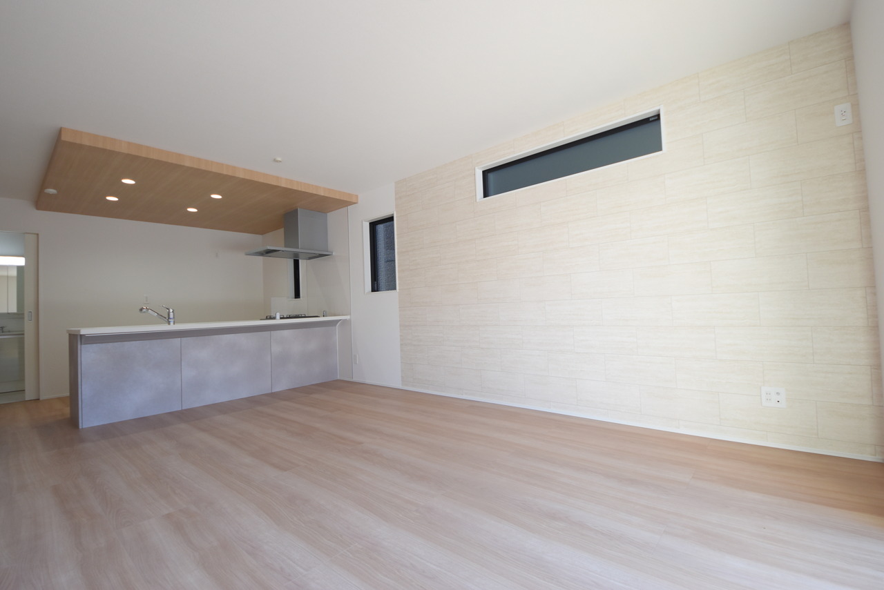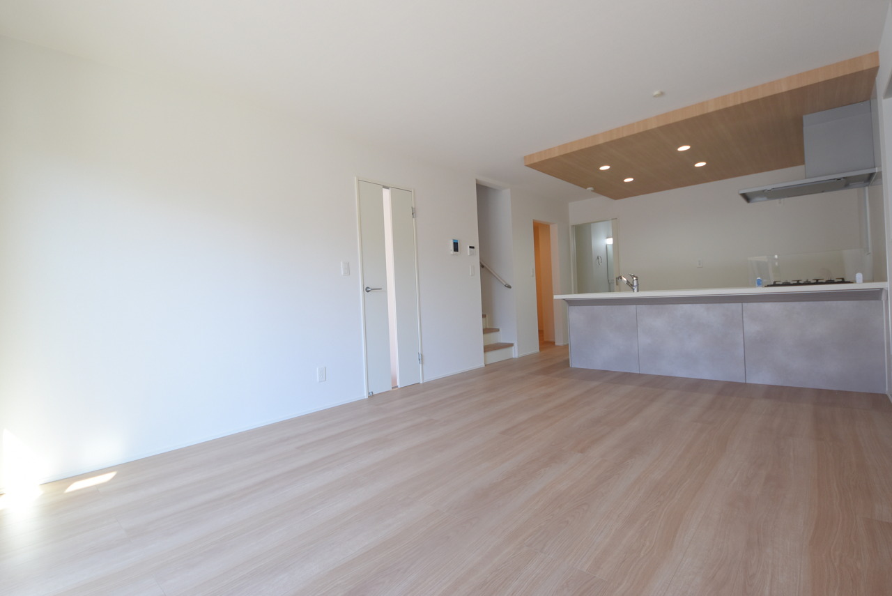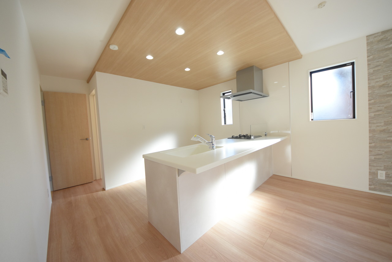 1号棟 リビングにいる家族の顔が見渡せるカウンターキッチン。お料理もより一層おいしく、楽しく。食器棚を背面に設置しても十分な広さを確保しています。 2025/11/28m