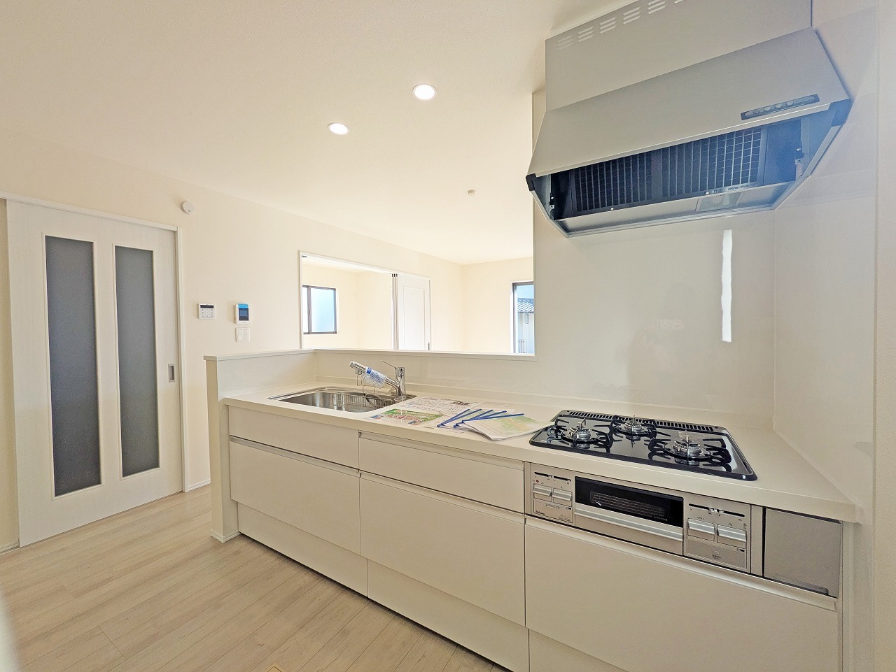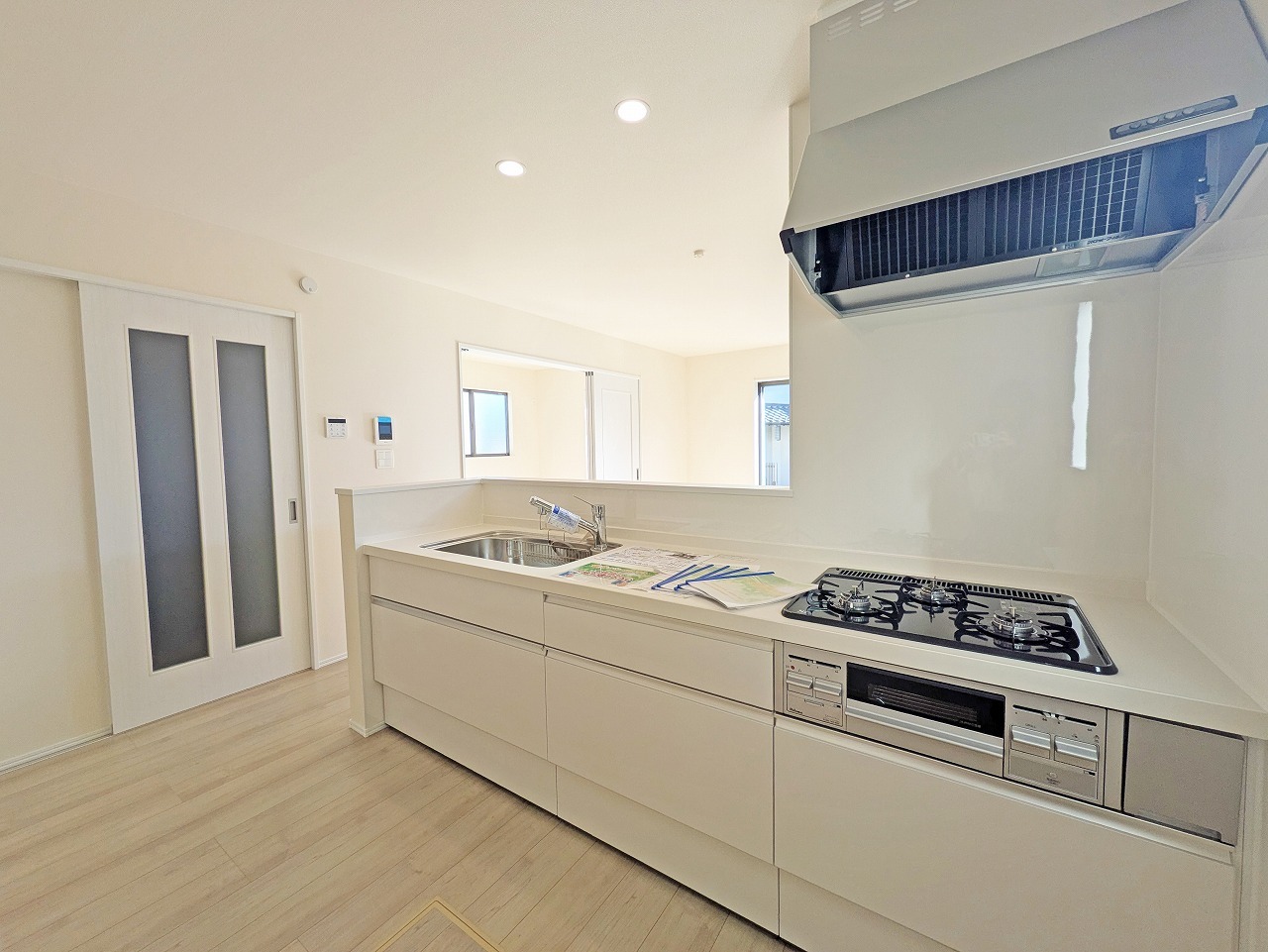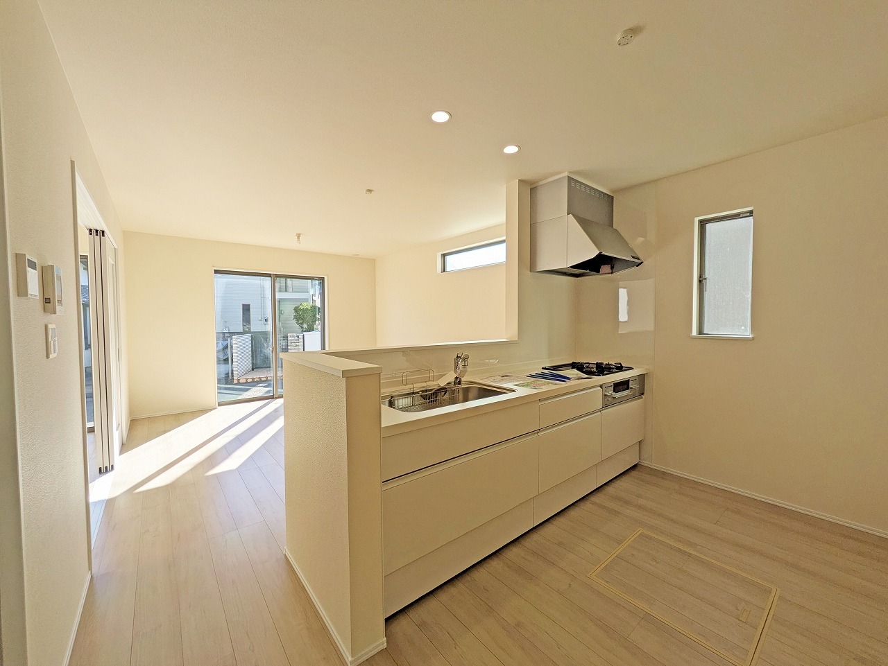 A号棟 吊戸棚をなくした対面キッチン、隣の部屋にいる方の様子もここからよく見えます。