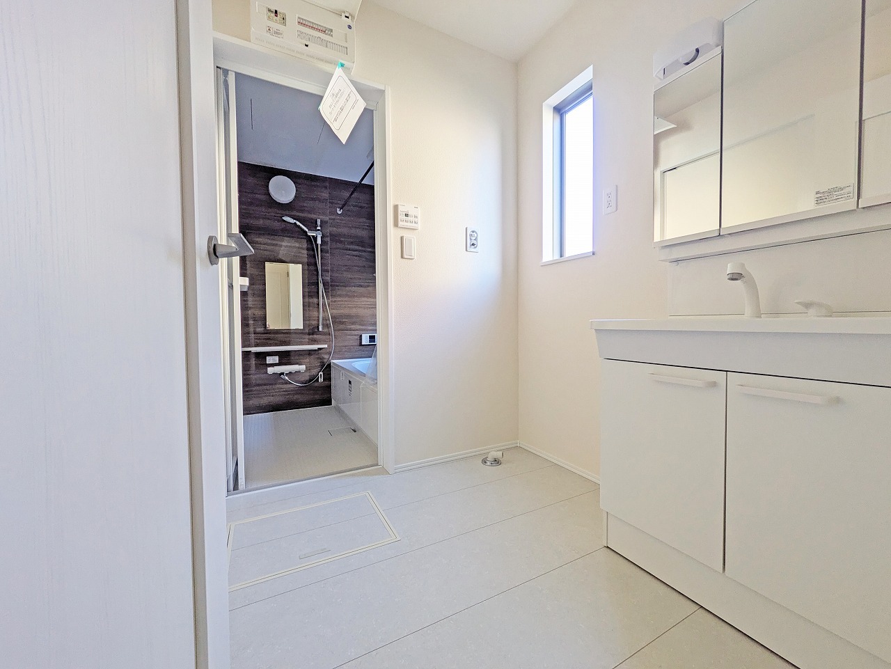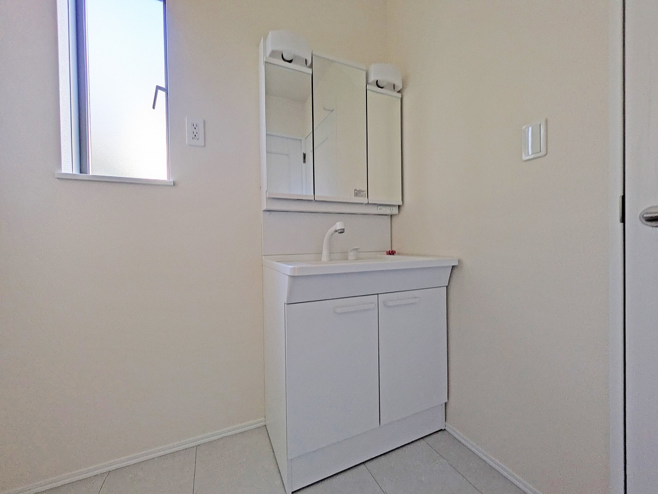 A号棟 収納豊富な三面鏡付洗面化粧台。水回りのあれこれがキレイに収まりそうですね。