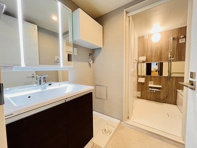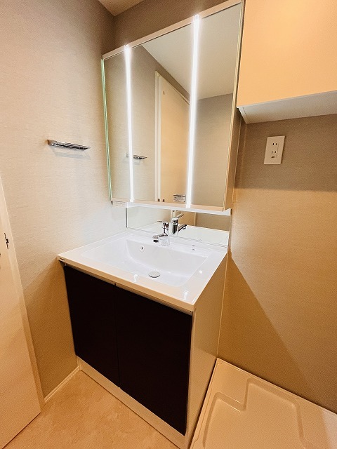 三面鏡に洗面台。 コンセントに照明機能、多機能性を備えた設備です。