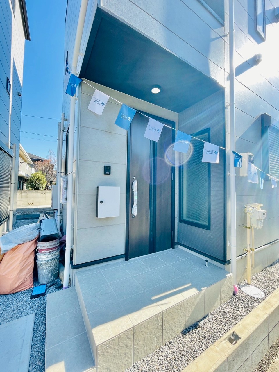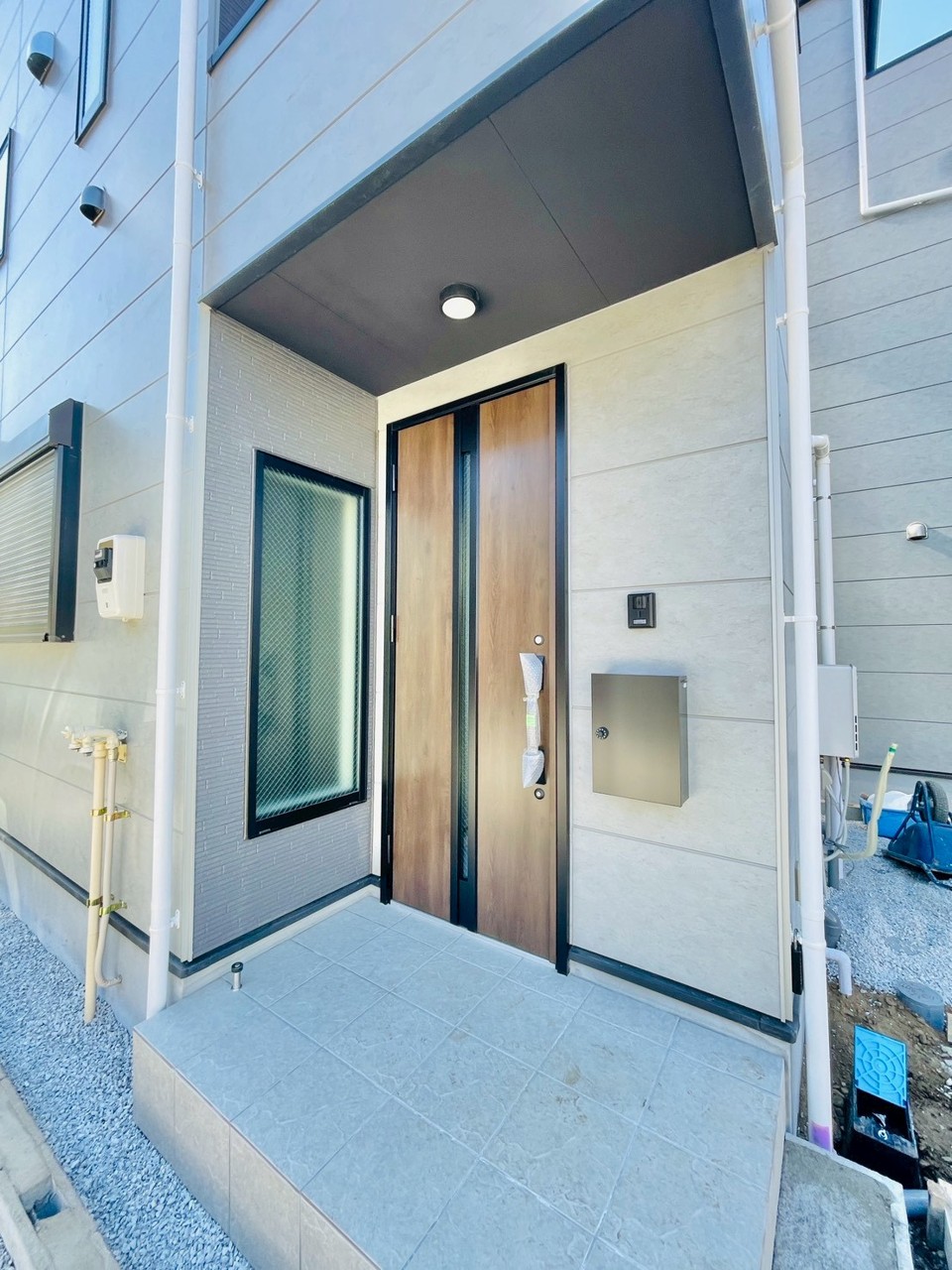 2号棟 ポーチのついた新築分譲物件。玄関の印象はいかがでしょうか?入口からご覧ください。
