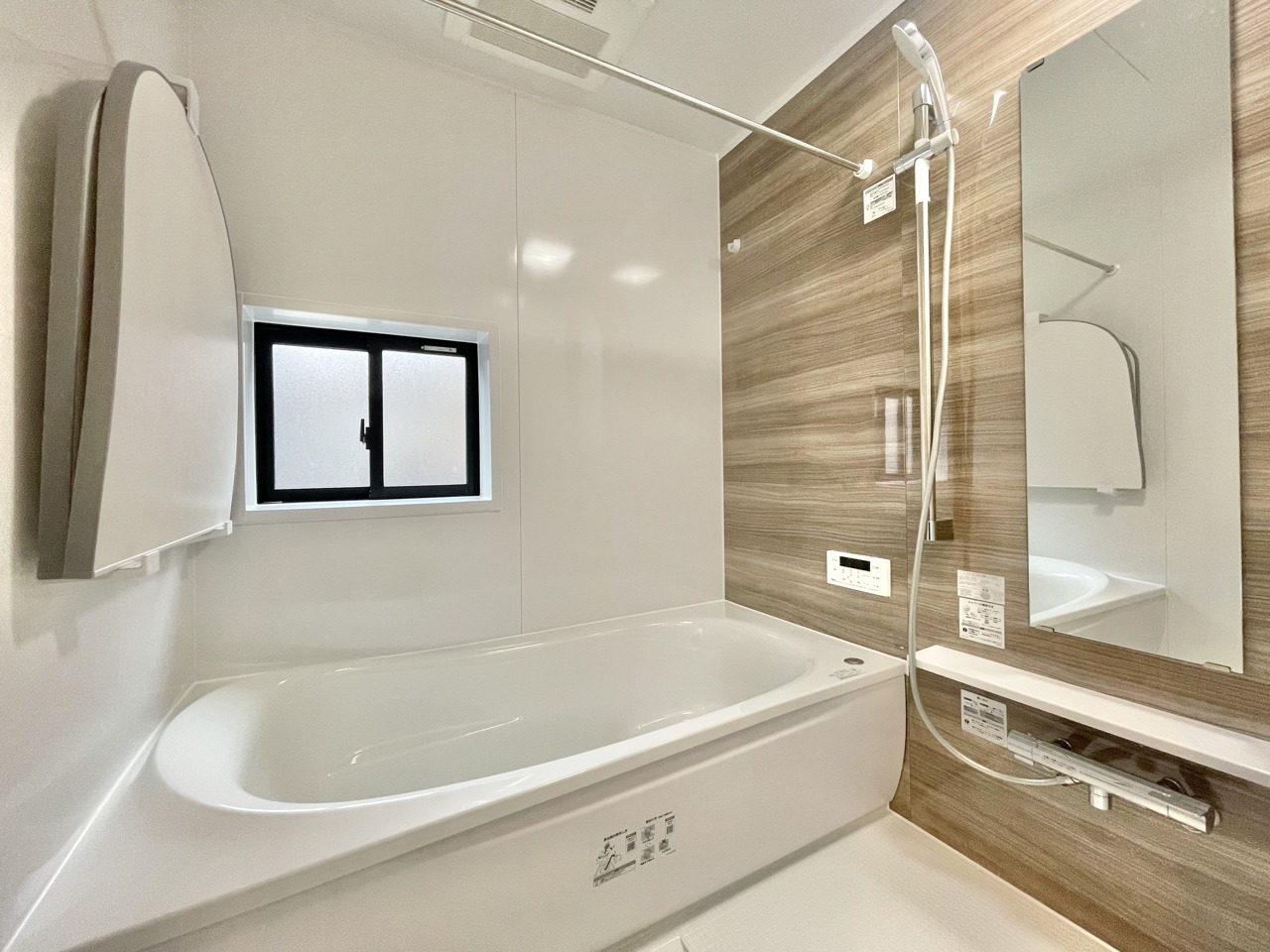 温もりある木目調の壁と清潔感のある空間が調和するバスルーム