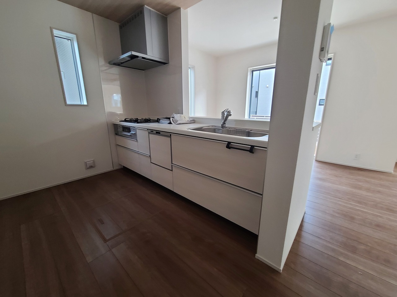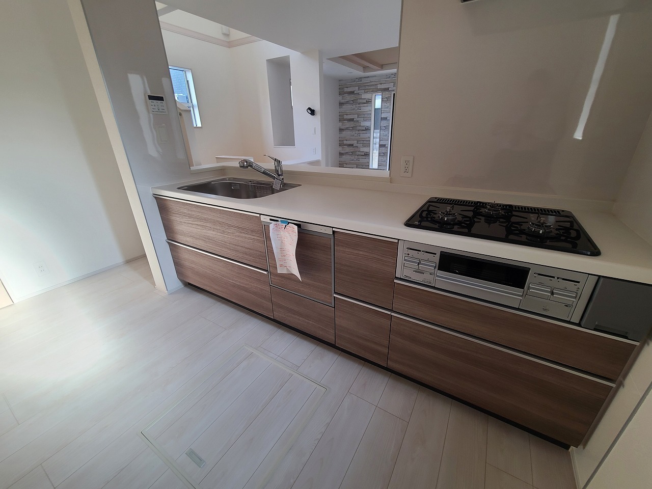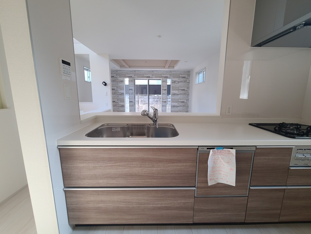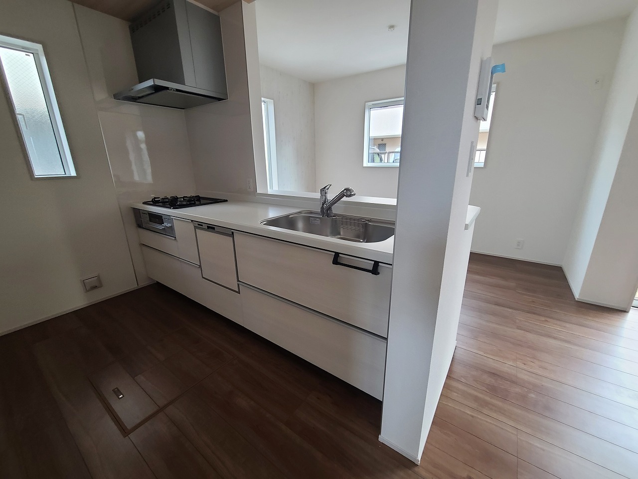 4号棟 リビングにいる家族の顔が見渡せるカウンターキッチン。お料理もより一層おいしく、楽しく。食器棚を背面に設置しても十分な広さを確保しています。