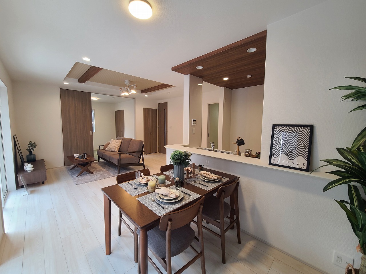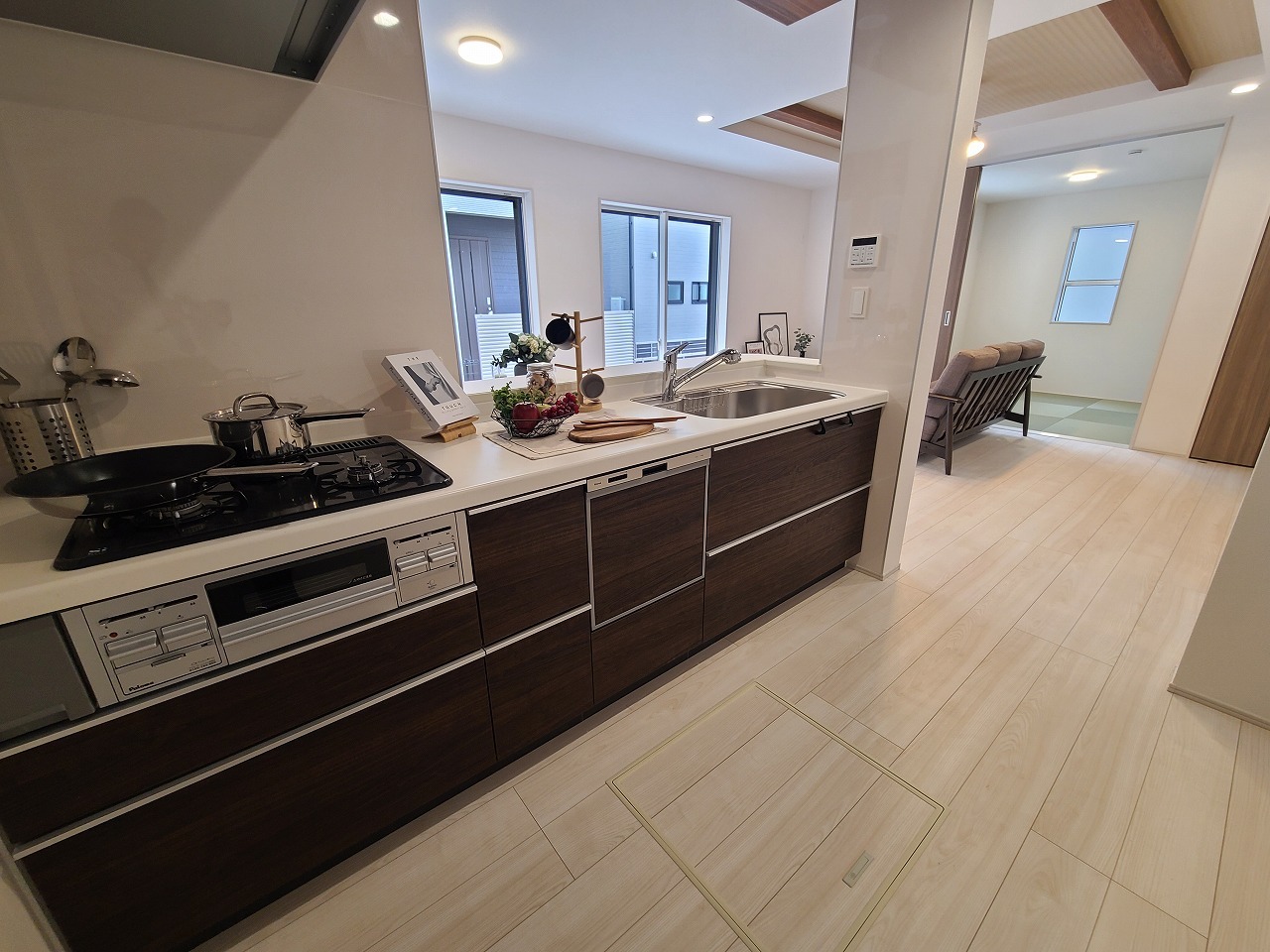 1号棟 リビングにいる家族の顔が見渡せるカウンターキッチン。お料理もより一層おいしく、楽しく。食器棚を背面に設置しても十分な広さを確保しています。