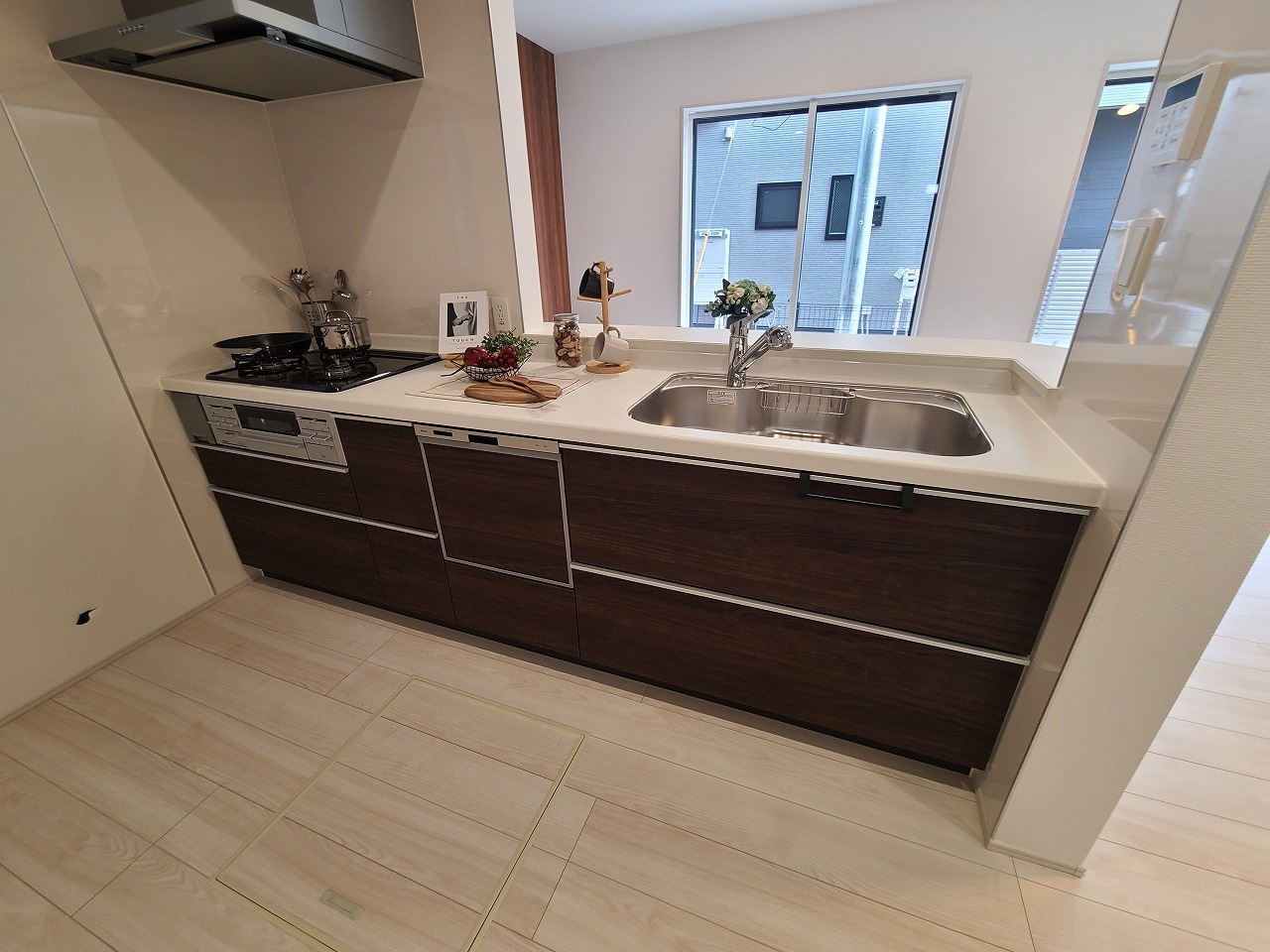 3号棟 リビングにいる家族の顔が見渡せるカウンターキッチン。お料理もより一層おいしく、楽しく。食器棚を背面に設置しても十分な広さを確保しています。
