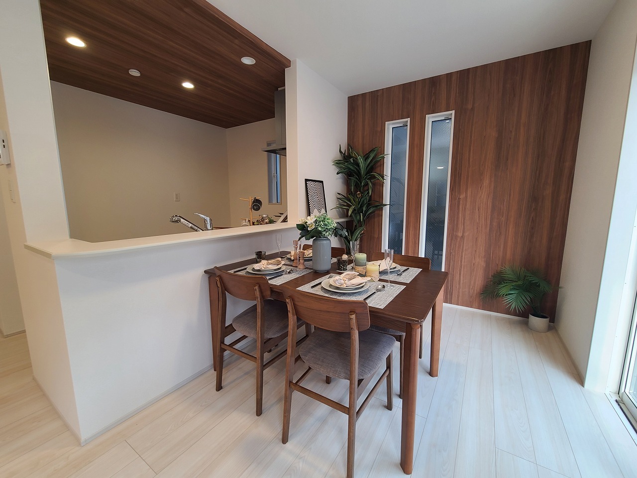 4号棟 家族団欒のリビング。陽光差し込む食卓には家族の会話とスマイルが溢れます。いつまでもここで食卓を囲みたくなる、そう感じさせてくれるスペース。