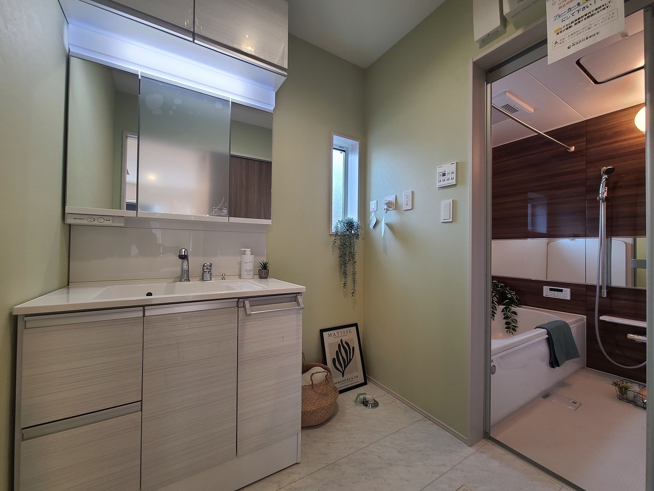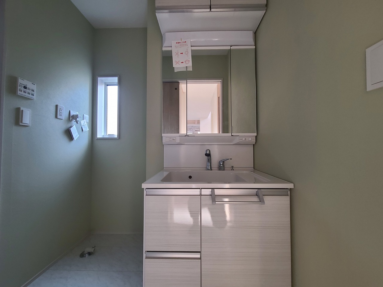 4号棟 使い勝手の良い洗面台、窓があることで換気もしやすく清潔感のある空間を保てます。